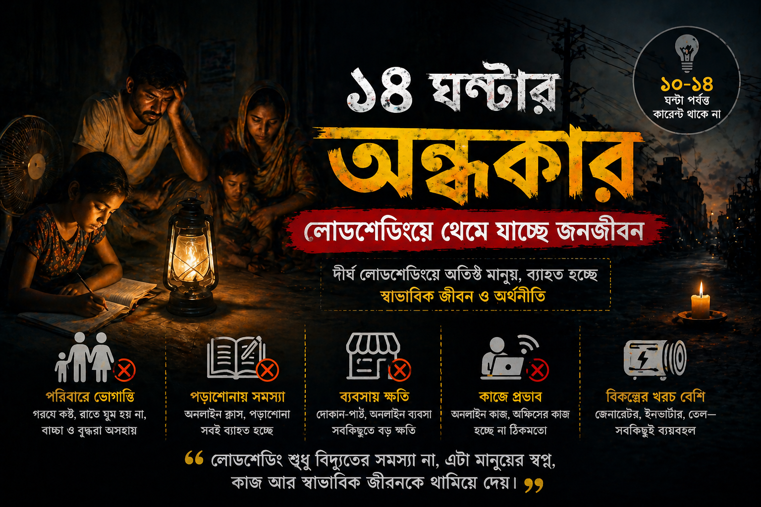 একটা পরিবার কিভাবে চলে, সেটা যারা ভুক্তভোগী তারাই ভালো বুঝে। গরমের মধ্যে ফ্যান চলে না, রাতে ঘুমানো যায় না, ছোট বাচ্চারা কষ্ট পায়, বয়স্ক মানুষরা আরও বেশি অসহায় হয়ে পড়ে। গ্রামের দিকে তো অবস্থা আরও খারাপ। অনেক সময় সারাদিনেই কারেন্ট আসে না। রাতের অন্ধকারে মানুষ কেরোসিন ল্যাম্প বা মোমবাতি জ্বালিয়ে বসে থাকে। এটা যেন আধুনিক যুগে থেকেও এক ধরনের পুরনো জীবনে ফিরে যাওয়া।