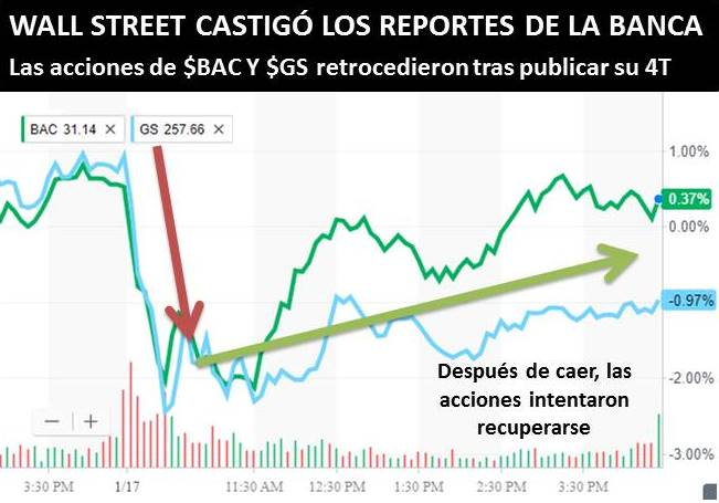 Aunque $BAC y $GS registraron unas ganancias ($0,47 y $5,68) por encima de lo esperado ($0,45 y $4,90), las acciones de ambos bancos cerraron en números rojos (-0,19% y -1,86%, respectivamente) en gran parte por el golpe recibido en el trimestre tras la aprobación de la reforma tributaria.
