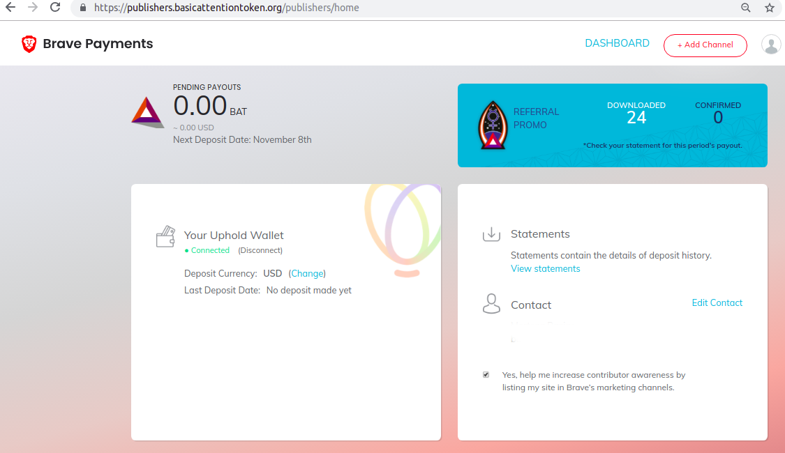 Step 3: Go to Brave payments dashboard and click on "+ Add Channel".