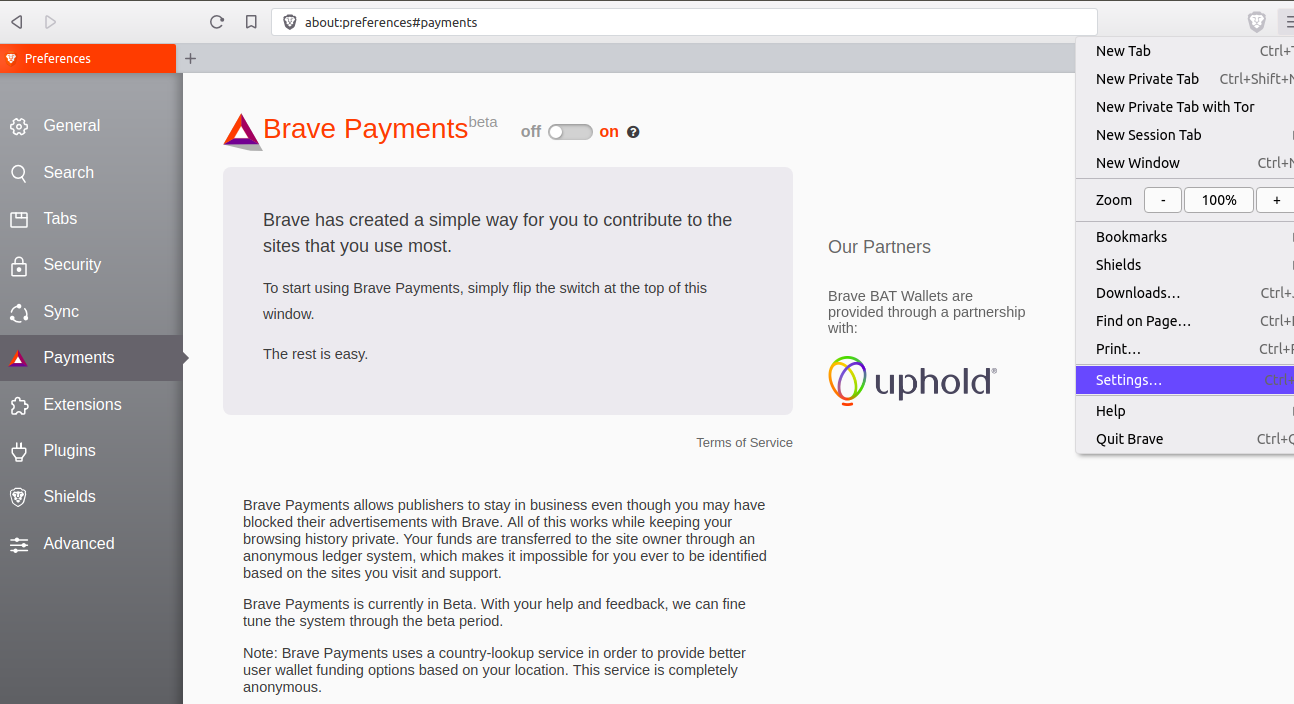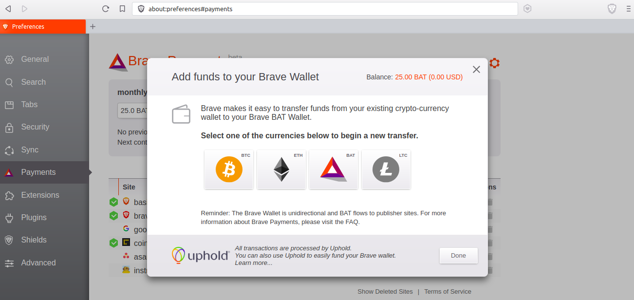 Step 2: Go to Brave payments dashboard and connect to your Uphold wallet.