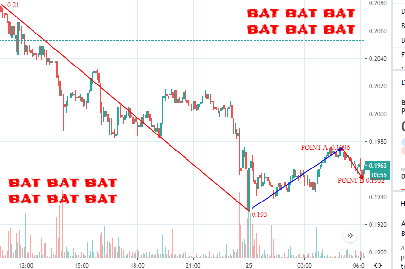 The above is the BAT market in terms of USDT . There are two points indicated,A and B Before point A, the BAT market can be seen to be tending in a downwards direction all the way to around $0 .193 from its previous high of $0.21. This downwards market movement for BAT has been as a result of a decrease in the number of users as well as publishers due to a decline in their revenue. This in turn also causes the advertisers to start looking for other platforms with huge number of users thus resulting to a decline in the utility function of BAT. This causes the demand for BAT to decline thus causing the price to decline to $0.193 as earlier stated. At $0.193,existing advertisers are purchasing some BAT so that to use them to advertise their business on the brave platform . This result to an increase in the demand for BAT thus causing the price to slightly increase to point A at $0.1996. At point A,the reward is further declined thus causing more users as well as publishers to exit the brave platform and join other well rewarding platform. This also causes the advertisers to exit the brave platform and join other platforms with huge number of users so that their business can gain more traffic. This result to a further decline of the BAT utility function thus causing its demand to decline which in turn causes the price to decline to point B at $0.1952 .If this will continue although I am not bearish for BAT,then the price can go as low as $0.14