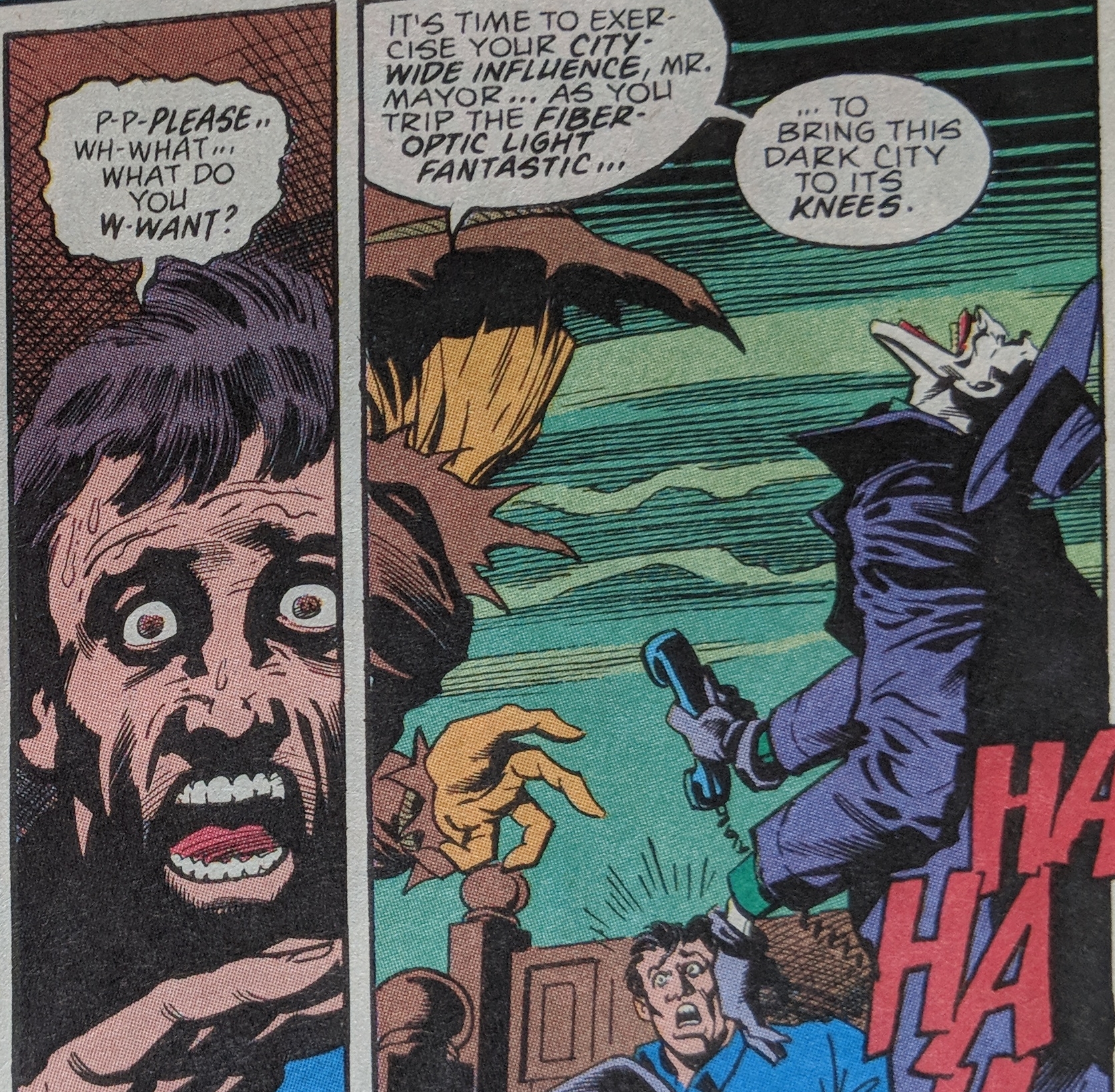 Tiffed he isn't getting what he wants, The Joker heads out muttering about what a fuckup Stirk is. Then out from behind a corner guess who shows up and is pretty bummed he wasn't first.