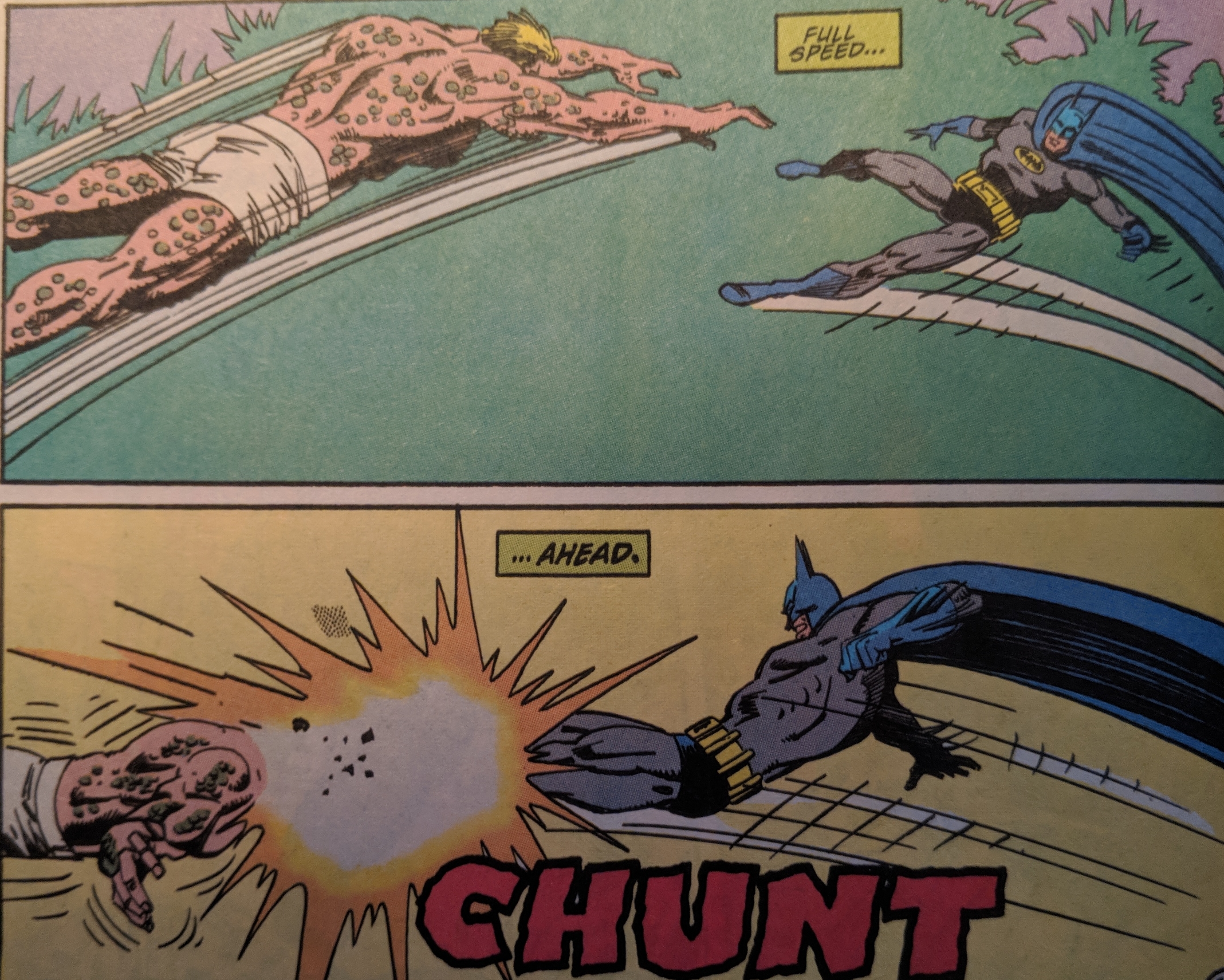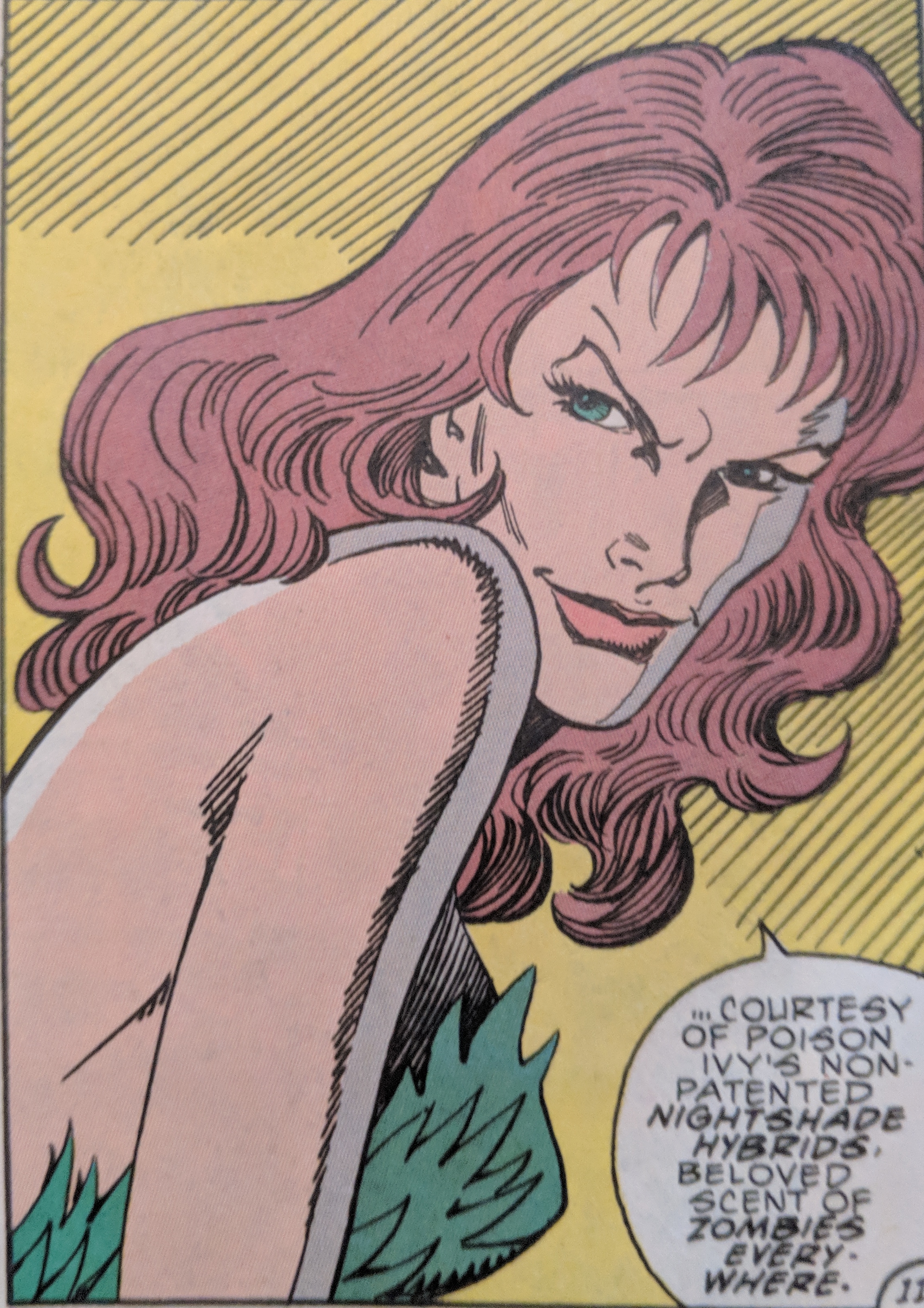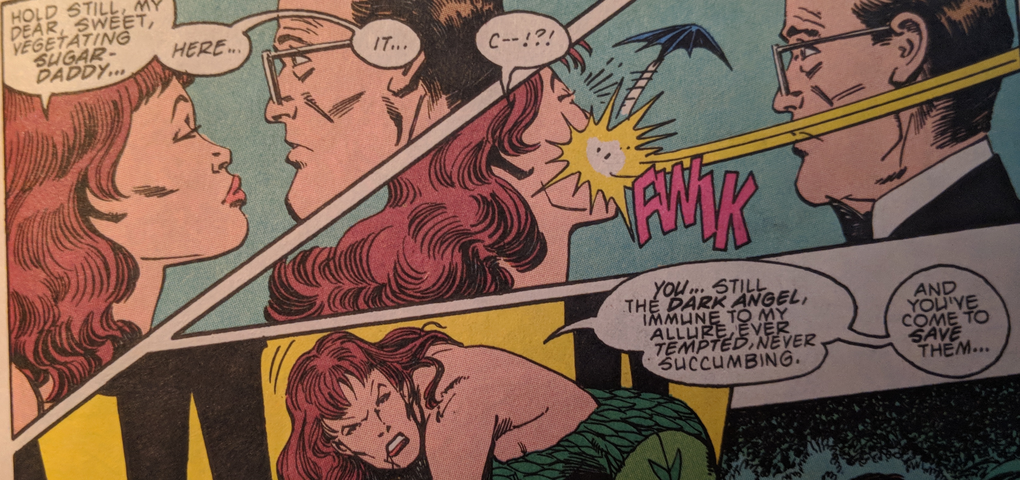 Batman does his best to stay on two feet. When he finds out that these Dead Fellows can't come back from Ivy's kiss she tells him isn't time he gave up to? And like King Leonidas to the Persian messenger, Batman boots her right in the face! Then calls for an ambulance and gas masks.
