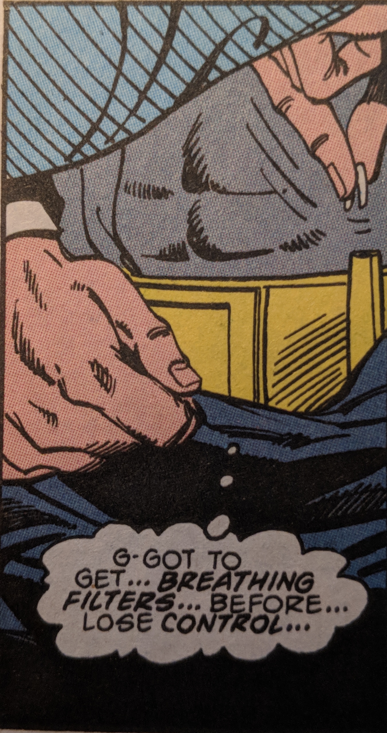 Lucious Fox grabs Bruce to mention how he's neglecting Wayne Enterprise affairs to the point... to the point... Bruce starts to get dizzy, but not from his recent nightly workouts. It's something in the air...