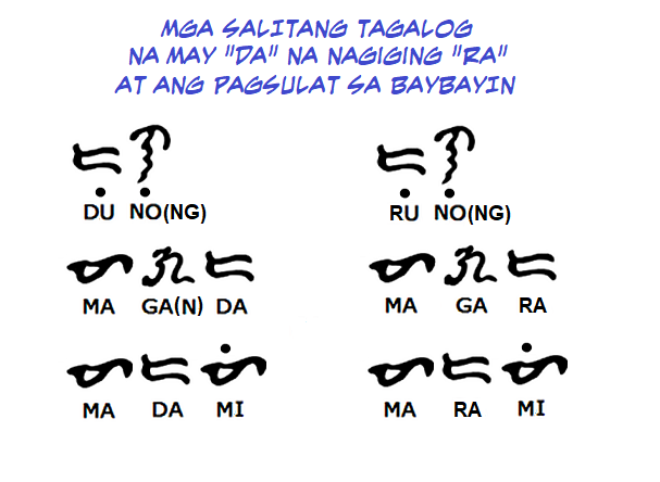 Sa Tagalog, ang /Da/ ay nagiging /Ra/ kapag patinig ang nauuna sa salita ngunit depende sa gumagamit nito. Mga halimbawa: dunong = runong, maganda = magara, madami = marami, atbp. Pag-aralang mabuti ang anyo sa Baybayin ng mga salitang Tagalog na ito:
