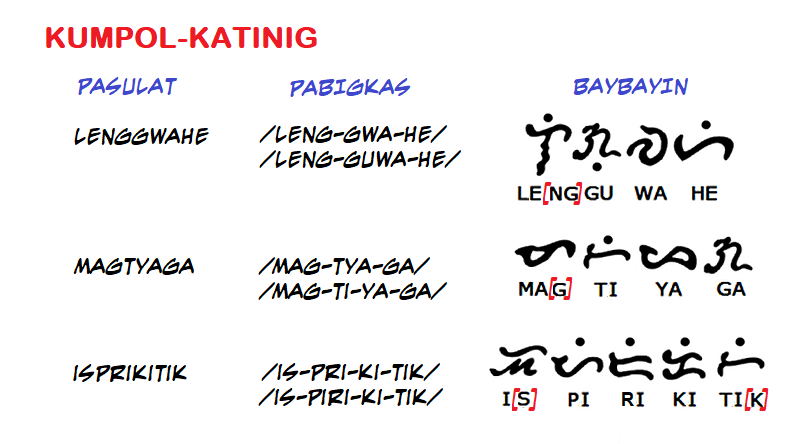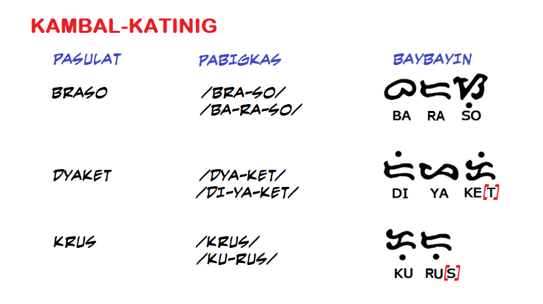 Sa Panitik Tagalog/Baybayin, inuuna ang pagbigkas bago ang pagsulat kapag may kambal-katinig o kumpol-katinig sa isang salita.
