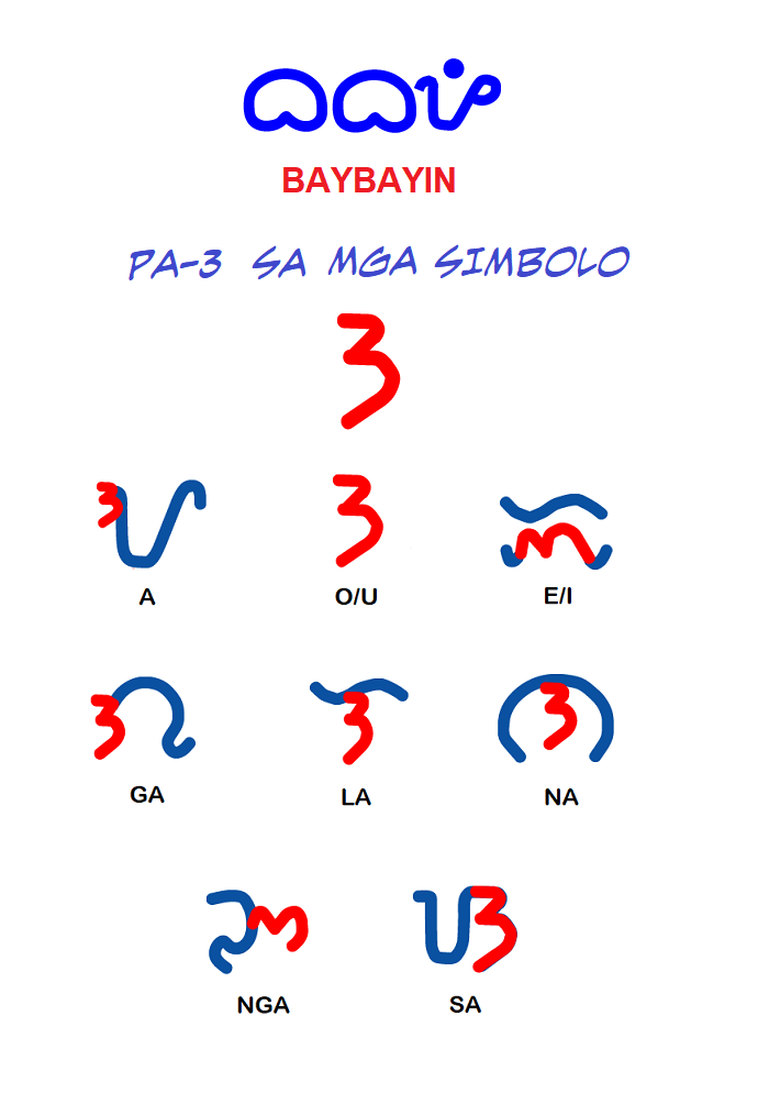 Ang pa-3 o anyong "tatlo" na kurba ay mapapansin sa mga sumusunod na karakter: A, E/I, O/U, Ga, La, Na, NGa, at Sa