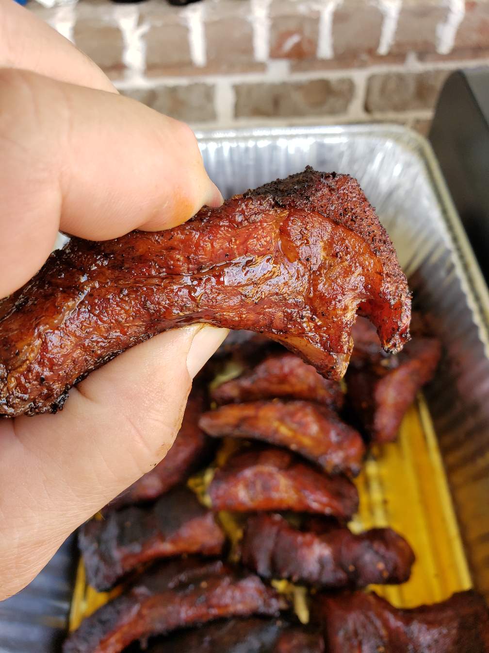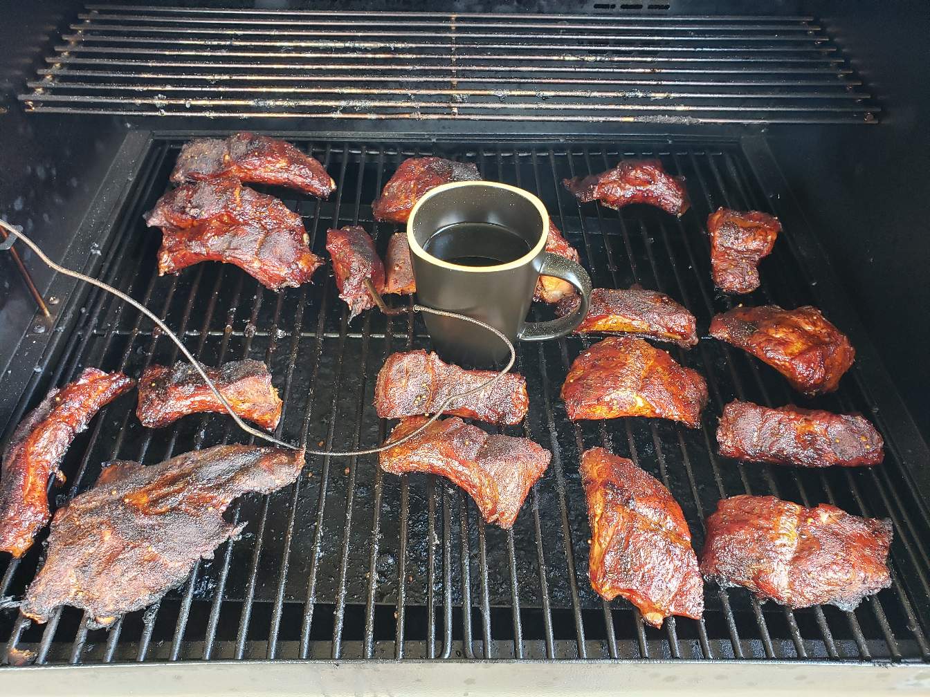 Looks like I'm smoking a cup of coffee also, but that adds the humidity I need to get that rib juicy inside and out.
