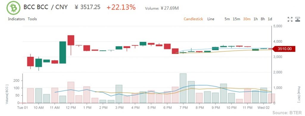Bter has about $4.3 million 24-hour trading volume for its two trading pairs BCC/CNY BCC/BTC. The former accounts for $4.26 million and the latter only $44,860 in volume.