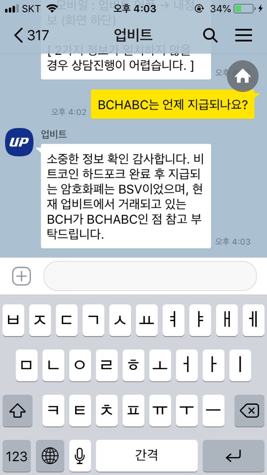 바이낸스처럼 BCHSV와 BCHABC가 모두 지원되는 것은 아닌지 궁금해 업비트 상담센터에 확인해보기도 했다. 업비트에서는 BCHABC가 따로 지급이 되지 않고 현재 거래되고 있는 BCH가 BCHABC라는 답변이 돌아왔다.
