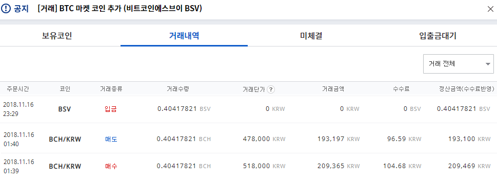 업비트는 이날 오후 10시18분께 BCH와 1대 1의 비율로 BSV를 지급하겠다고 전했다. 지급 완료 후 원화마켓에 상장하겠다는 덧붙였다. 그러나 기자의 계정에는 공지가 올라온 후 1시간이 지나도록 BSV가 지급되지 않아 ‘스냅샷 직후 1분도 지나지 않고 매도해서 해당 대상이 아닌가’, ‘이대로 8.36%의 손실만 보고 체험기를 쓰지 못 하게 되는 것 아닐까’ 등등의 고민이 머릿속을 스쳐갔다. 그러던 중 다행히도 BSV가 같은 수량만큼 지급됐다.
