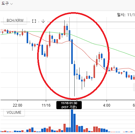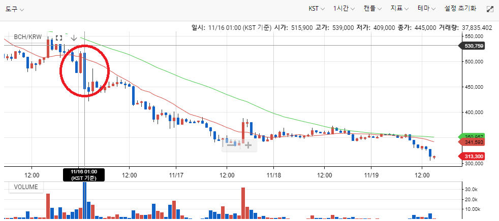 하드포크를 1분 앞둔 16일 오전 1시39분 미리 입금해 놓은 소량의 돈으로 0.40417821개의 BCH를 구입했다. 그리고 오전 1시40분00초, 스냅샷 시점이 지나자마자 수직 낙하하는 그래프를 마주할 수 있었다.