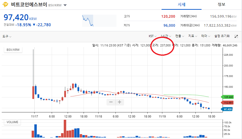 16일 저녁 상장 직후 23만7000원까지 올랐던 BSV는 19일 오후 5시 현재 9만720원으로 58.8% 미끄러졌다. 이는 전반적인 암호화폐 하락장과 맞물린 것으로 보인다.