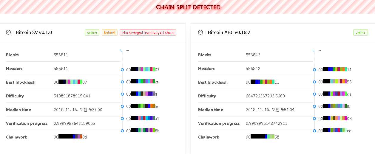 16일 새벽, 예정대로 비트코인캐시의 하드포크(체인분리)가 일어났다. 네트워크 업그레이드 전에 극적 합의가 있을 것이란 전망도 있었지만, 결국 비트코인ABC와 비트코인SV 진영은 각자의 길을 걷게 됐다. 하드포크 기준이 되는 스냅샷 시점 이후, 비트코인캐시의 가격은 수직낙하한 후 횡보세를 보이고 있다.