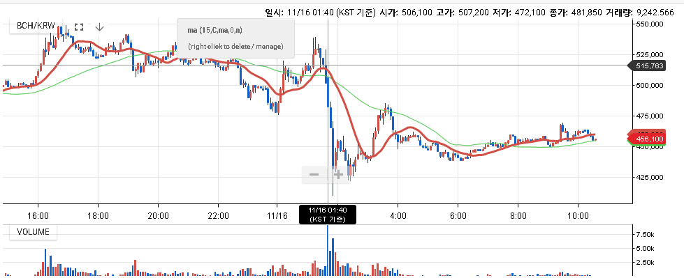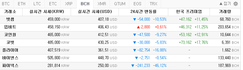 한편, 한국시간으로 스냅샷을 찍은 16일 오전 1시40분을 기점으로 비트코인캐시의 가격은 크게 떨어졌다. 국내 암호화폐 거래소 업비트 차트에서도 확인할 수 있듯이 52만8000원대를 지키던 비트코인캐시는 스냅샷을 찍은 직후 29% 가까이 추락한 41만136원으로 곤두박질쳤다. 현재 국내 거래소에서는 대부분 45만 원대를 유지하고 있다.