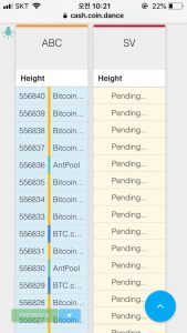 포크모니터와 코인댄스에 따르면 이날 오전 10시20분 기준으로 ABC는 55만6842개의 블록을, SV는 55만6811개의 블록을 생성했다. ABC가 31개 블록을 앞서고 있다. ABC 풀은 비트코인닷컴이 주도로 채굴하고 있으며, 앤드풀과 비티씨닷컴도 채굴에 가세하기 시작했다. SV는 코인긱 풀을 이끌며 멤풀이 함께하는 중이다.