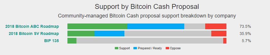 13일 비트코인 정보업체 코인댄스(CoinDance)가 비트코인캐시 진영에 대해 조사한 결과 기업이 비트코인 ABC를 지지하는 비율은 73.5%, 비트코인 SV에 표를 던진 비율은 35.9%로 나타났다.