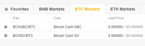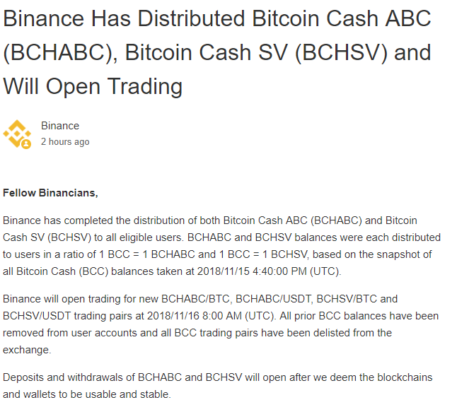 암호화폐 거래량 기준으로 세계 1위인 바이낸스(Binance)는 한국시간 오후 5시에 BCHABC와 BCHSV의 거래를 개시하겠다고 밝혔다. 현재 바이낸스 거래 목록에 BCH는 사라진 상태다.
