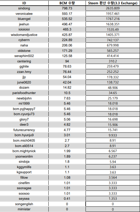 금일부로, BCM 토큰 홀더에 대한 청산에 따른 환산 스팀을 하기와 같이 지급합니다.