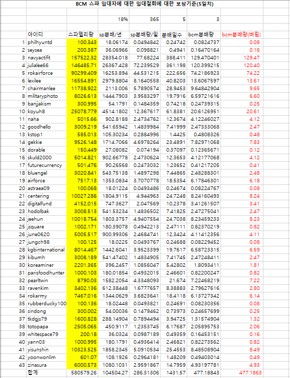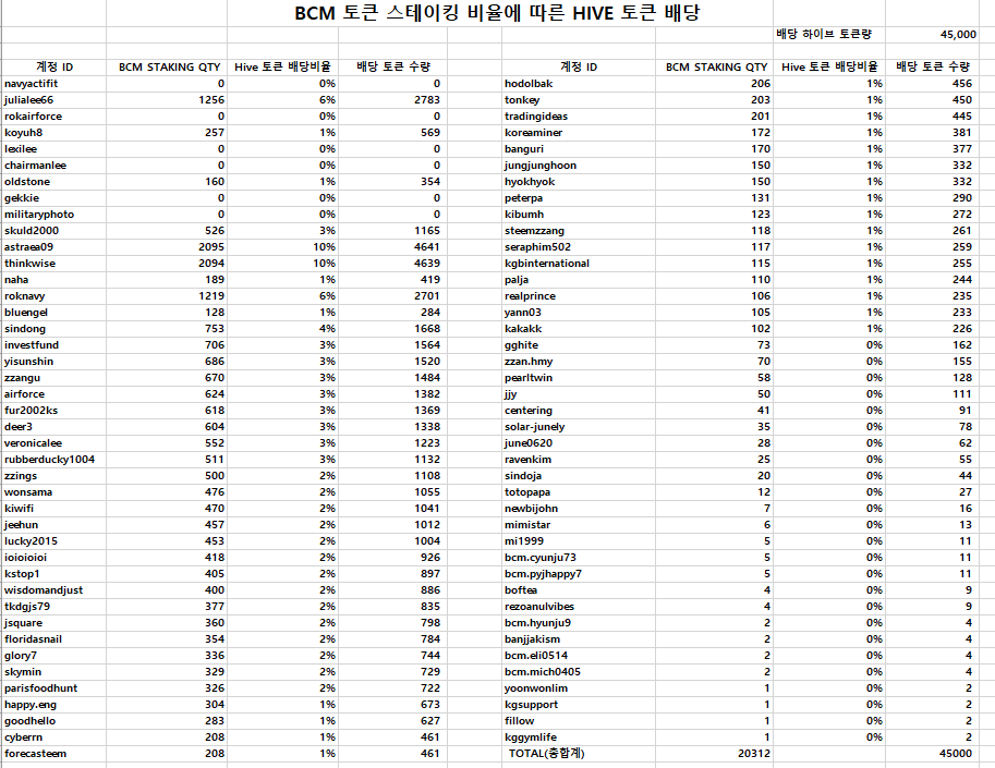 BCM토큰 스테이킹 비율에 따른 HIVE 토큰 배당 리스트에 제가 누락된것 같습니다.