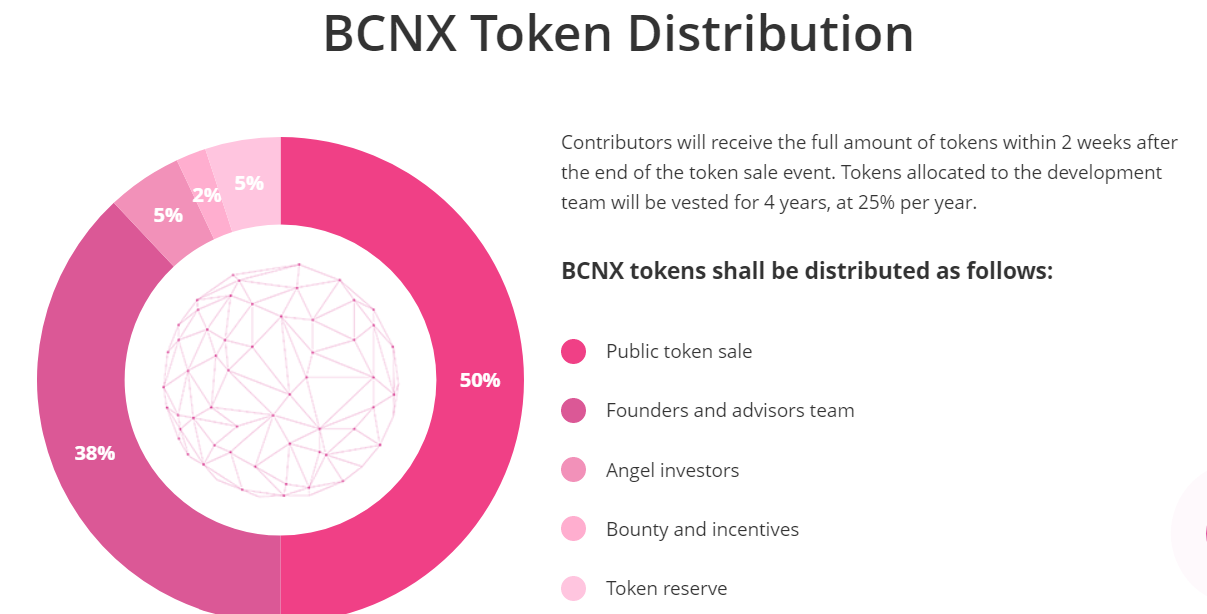 BCNEX borsasının kendine ait bir tokenı olacaktır. Sembolü BCNX olup 200 milyon adet olacaktır. Token fiyatı 0.15 USD ve 0.45 USD arasında değişecektir. Soft-cap hedefi 2 milyon USD olarak , hard-cap hedefleri ise 15 milyon USD olarak belirlenmiştir. Token alımında ise; BTC, ETH, BCN ve USDT birimleri kabul edilecektir. Token alımında KYC sistemi kullanılacaktır.