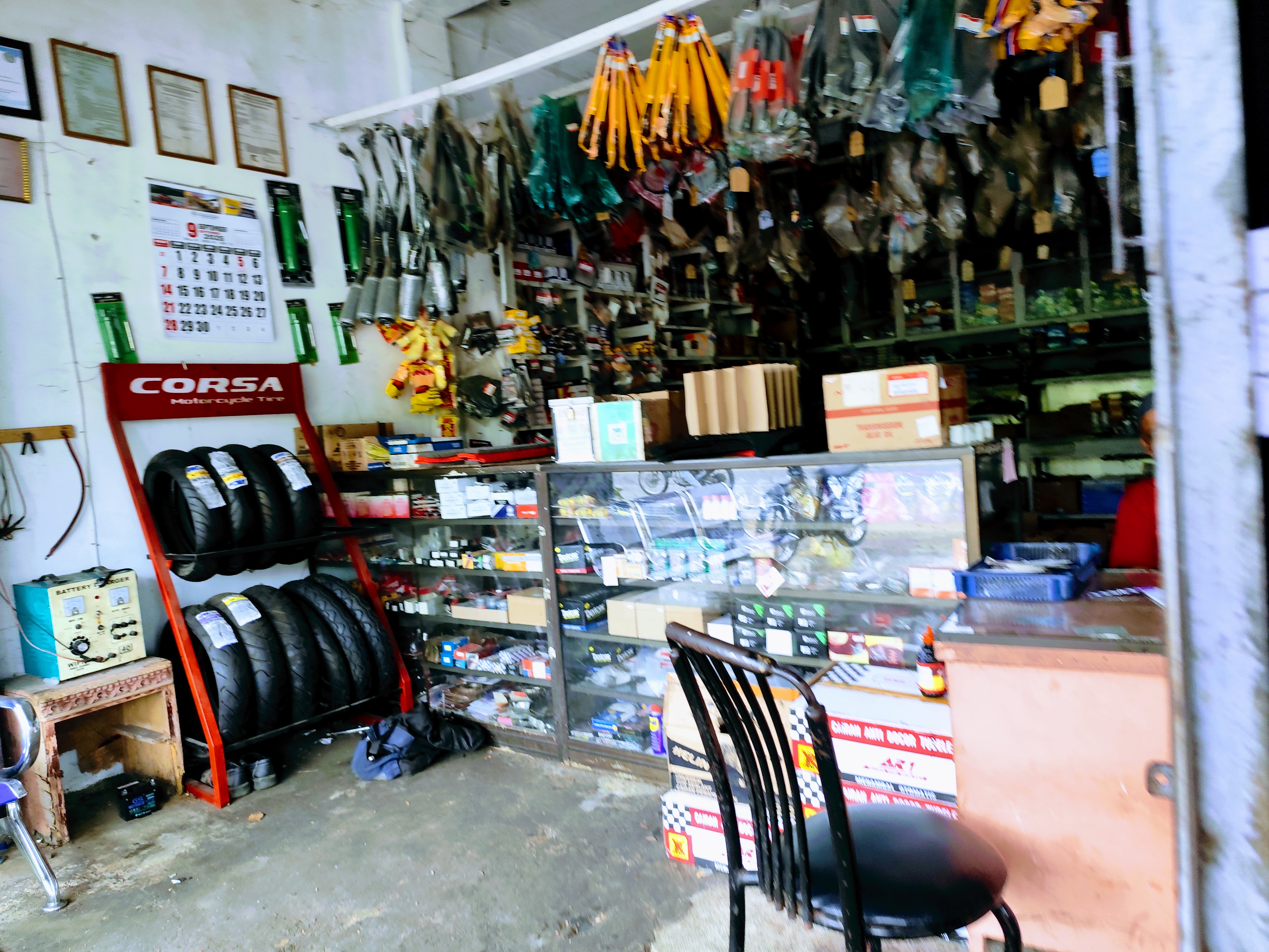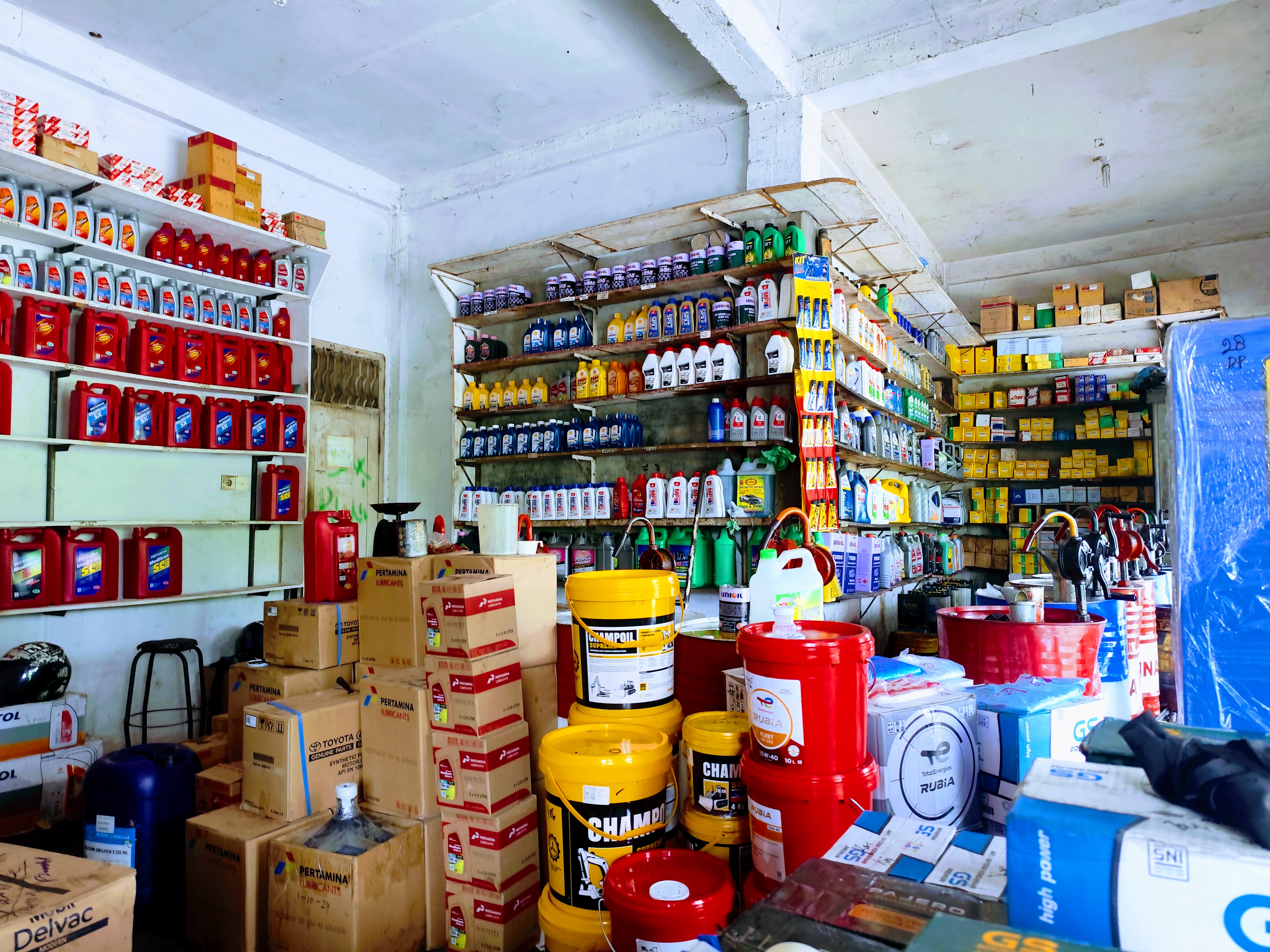 Rak pajangan di dalam bengkel tertata rapi dengan berbagai merek oli untuk sepeda motor dan mobil. Susunannya memudahkan pelanggan dalam memilih sesuai kebutuhan kendaraan mereka. Kehadiran stok yang beragam ini menunjukkan bahwa Bengkel Indah Raya Service cukup siap dalam mendukung layanan ganti oli, sehingga pelanggan tidak perlu repot mencari produk ke toko lain.