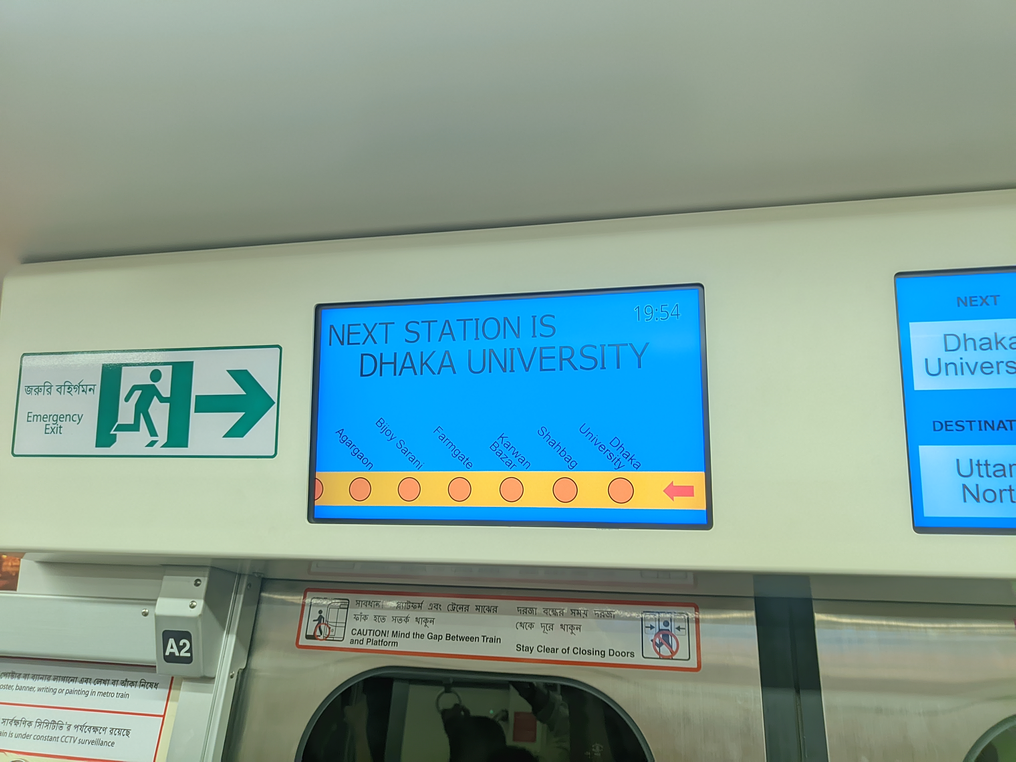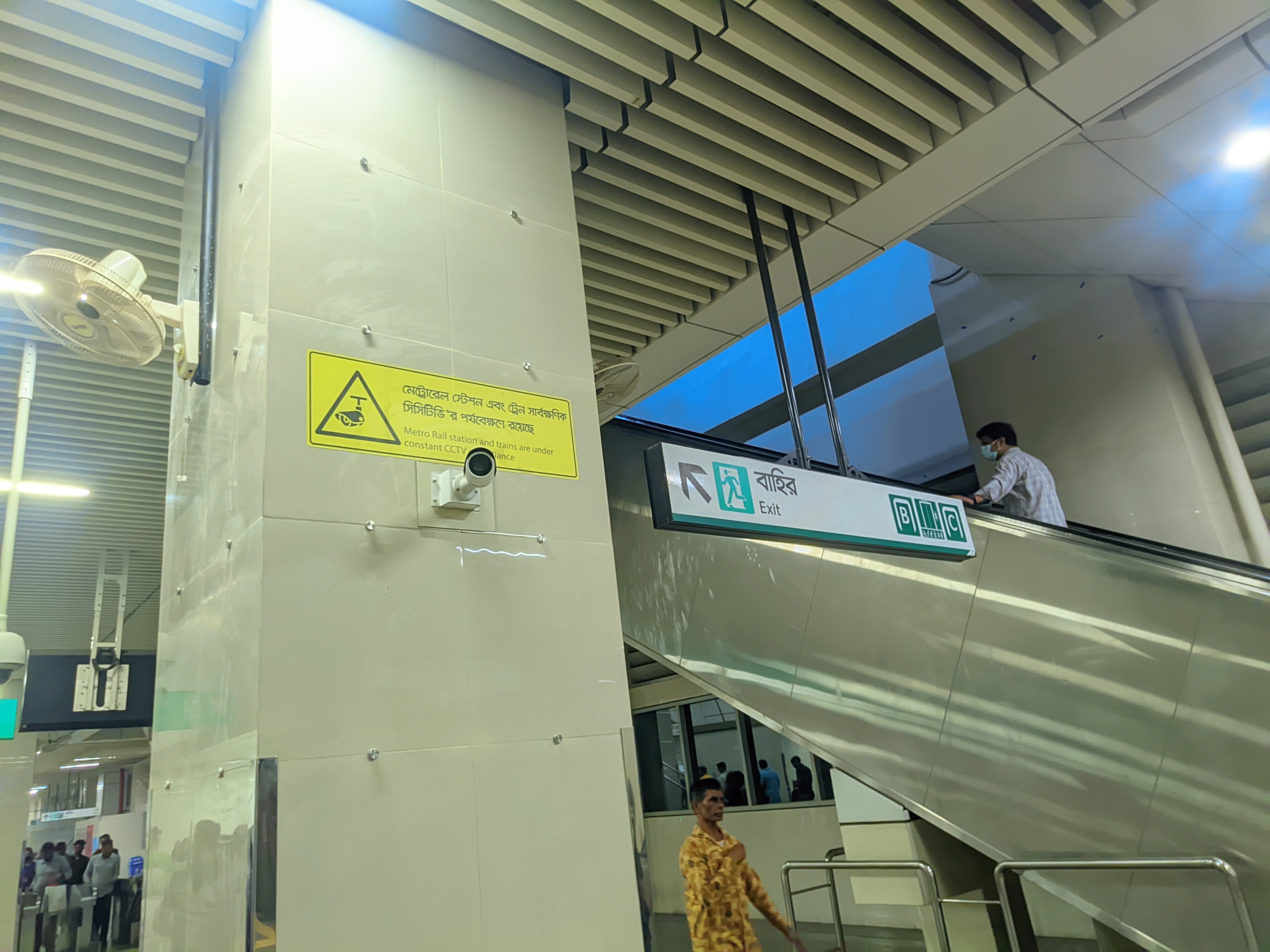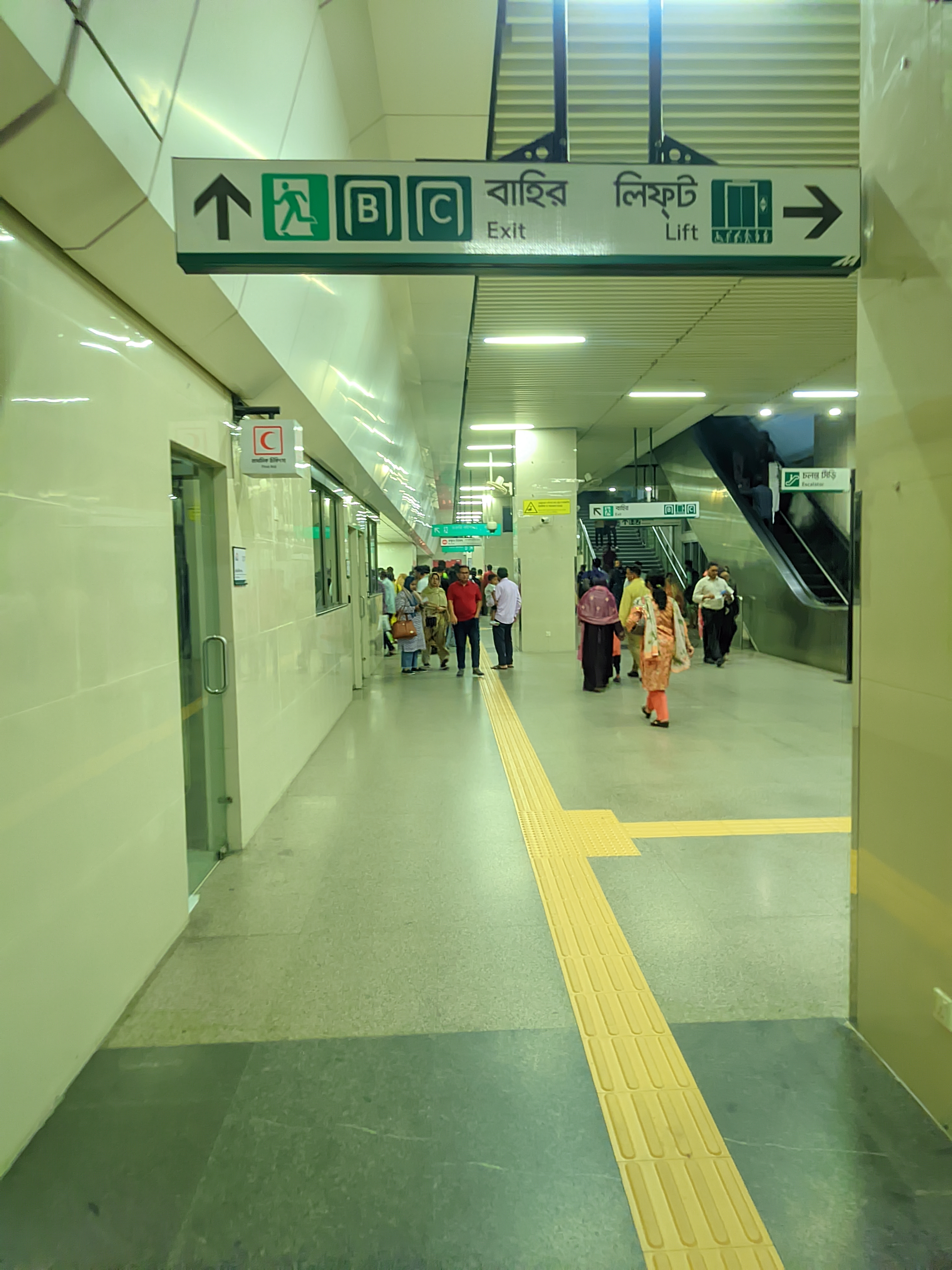 Then I went up the escalator. Going up, I saw that the platform was quite spacious and beautifully designed. The train schedule was being displayed on digital boards all around. This made it easy for passengers to understand when the train would arrive. Within a short while, the announcement of the train's arrival was heard. The Metrorail station has a huge platform. There is a seating arrangement for passengers at the station. The train arrives at the station every seven minutes. There is a huge clock on the platform.