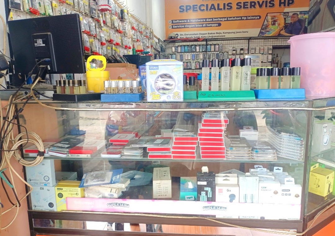 Dalam ruangan ruko ini terdapat barang yang sangat padat, walaupun sangat padat toko service HP ini tetap terlihat bersih, rapi dan enak di pandang mata. Di saat memasuki toko ini kita akan mendapatkan sebuah rak berbentuk letter L pada bagian rak depan toko terdapat parfum yang yang susun rapi, parfum ini di jual ya sahabat steemian. Selain susunan parfum di rak paling depan toko juga terdapat sebuah TV yang digunakan untuk CCTV. Jadi, ruko ini di pantau oleh CCTV.