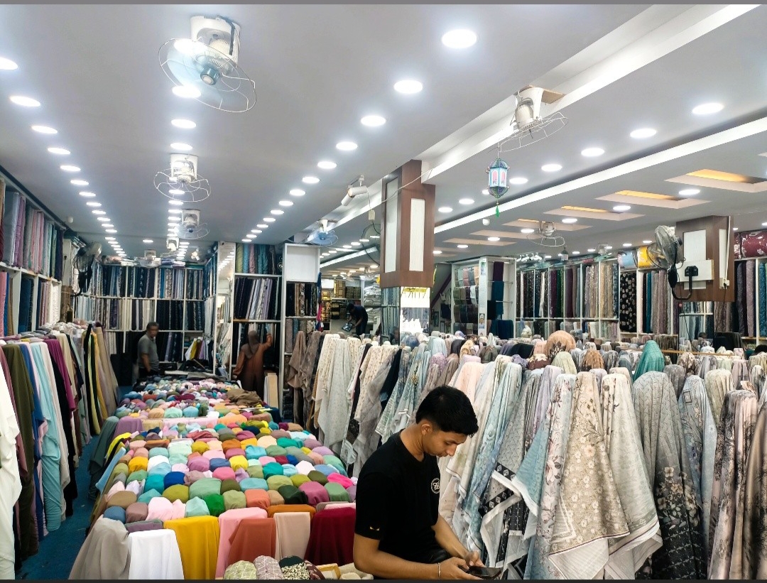 Saat memasuki toko kami diharuskan membuka alas kaki dikarenakan toko ini menggunakan hambal untuk lantainya. Ruangan dalam toko tiga pintu ini hampir seluruh ruangan dipenuhi dengan kain, mungkin jika ada orang yang gemuk akan sangat susah masuk ke toko ini. Hampir tidak ada jalan , bahan kain yang di pajang dan susun sudah sangat penuh.