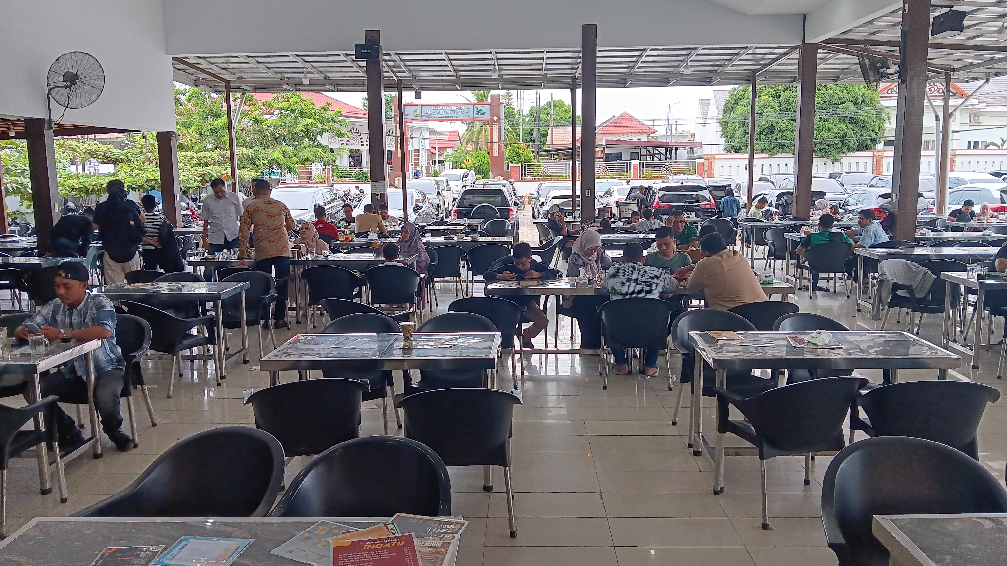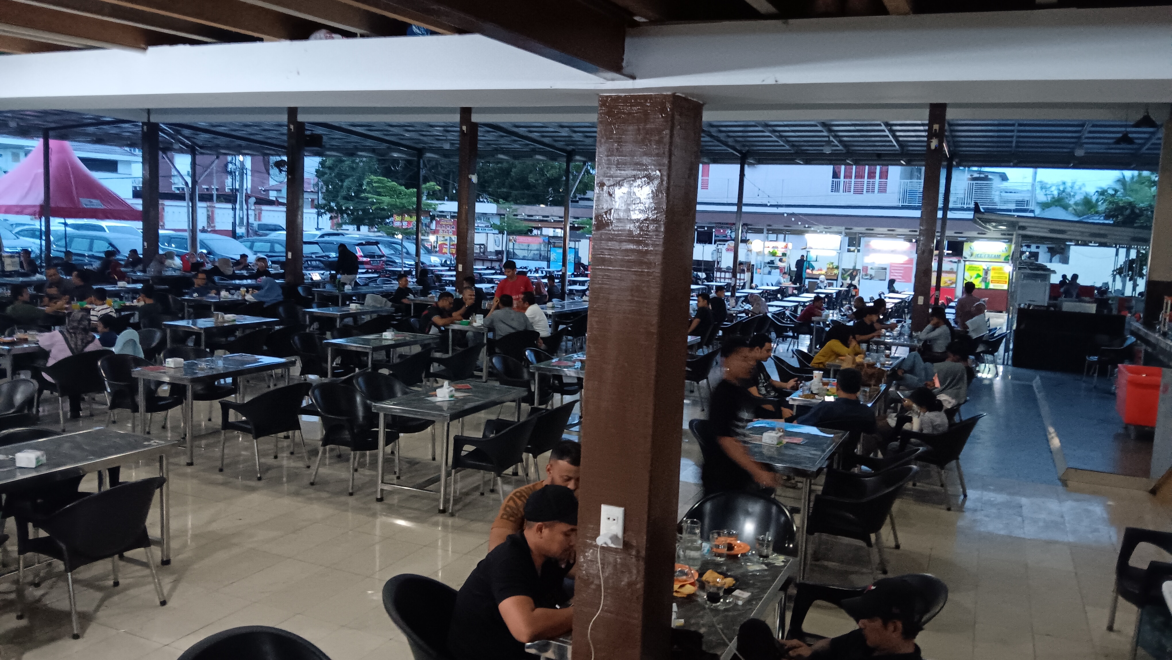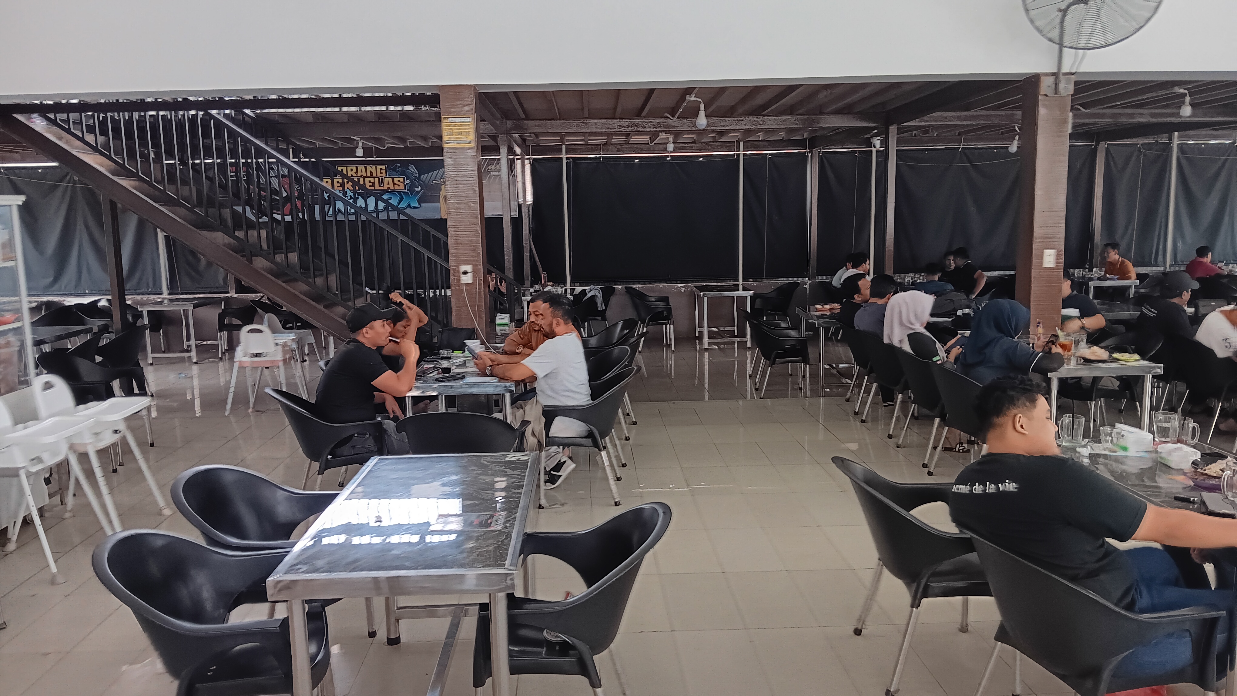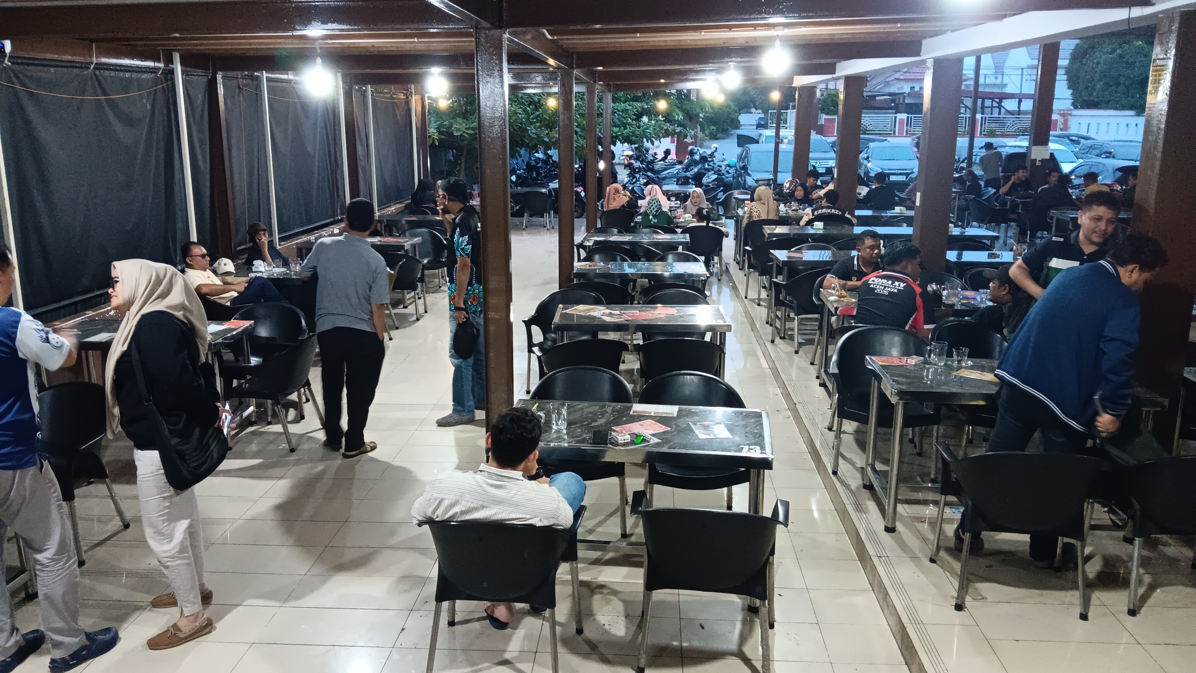 Suasana berbeda tampak di area dalam. Beberapa pelanggan masih duduk menikmati hidangan, meskipun jumlahnya jauh lebih sedikit dibanding hari-hari sebelumnya. Kontras antara area luar yang kosong dan bagian dalam yang masih beraktivitas mencerminkan dampak situasi terkini terhadap sektor kuliner.