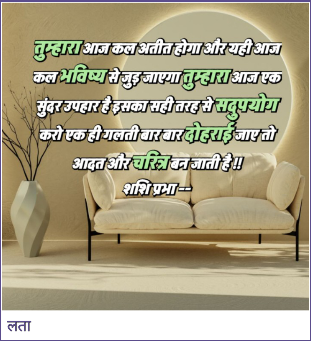 Beautiful thoughtsshashiprabha (66)in #beautiful • 9 months ago तुम्हारा आज कल अतीत होगा और यही आज कल भविष्य से जुड़ जाएगा तुम्हारा आज एक सुंदर उपहार है इसका सही तरह से सदुपयोग करो एक ही गलती बार बार दोहराई जाए तो आदत और चरित्र बन जाती है !! शशि प्रभा -- #thoughts