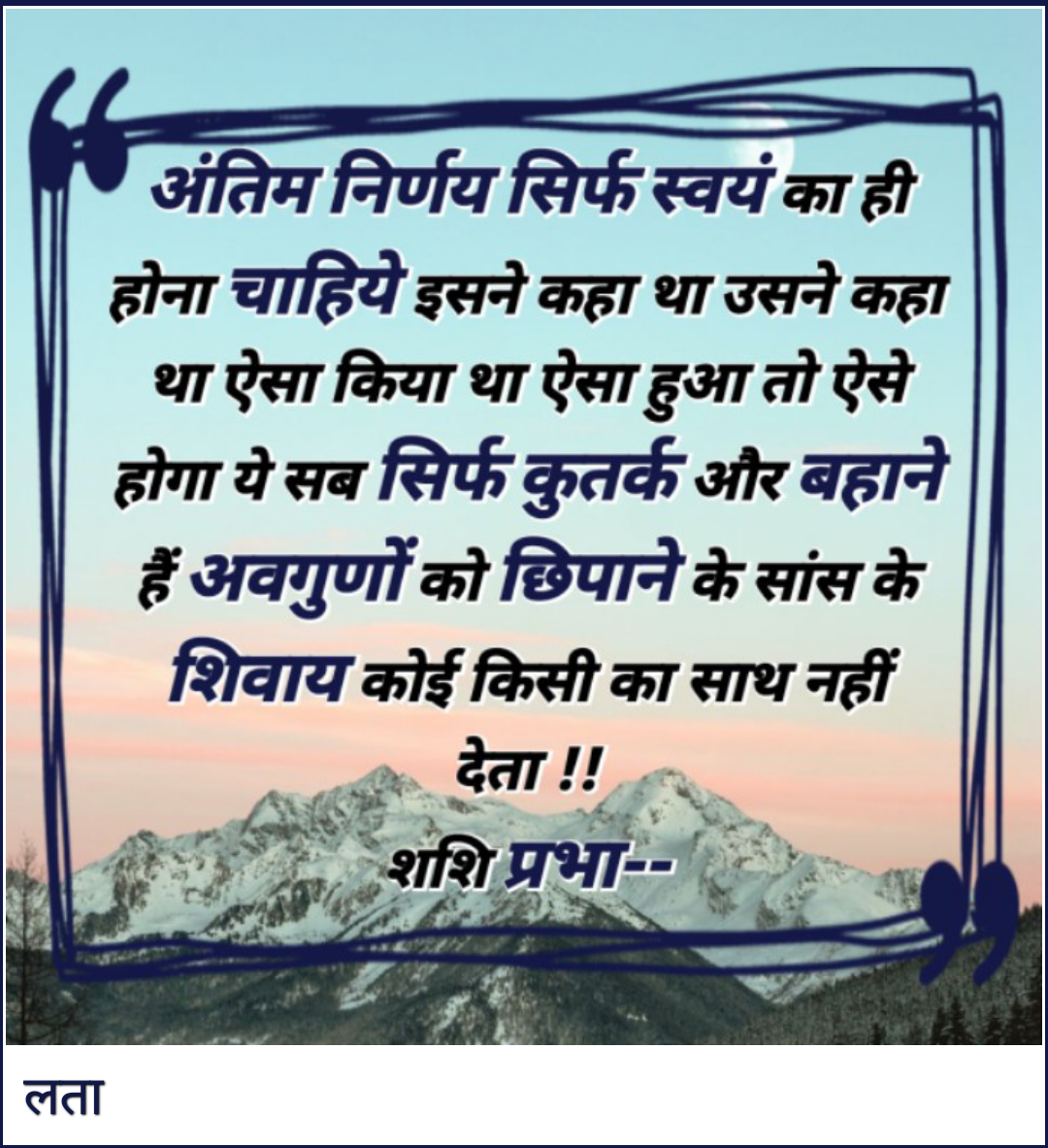 अंतिम निर्णय सिर्फ स्वयं का ही होना चाहिये इसने कहा था उसने कहा था ऐसा किया था ऐसा हुआ तो ऐसे होगा ये सब सिर्फ कुतर्क और बहाने हैं अवगुणों को छिपाने के सांस के शिवाय कोई किसी का साथ नहीं देता !!