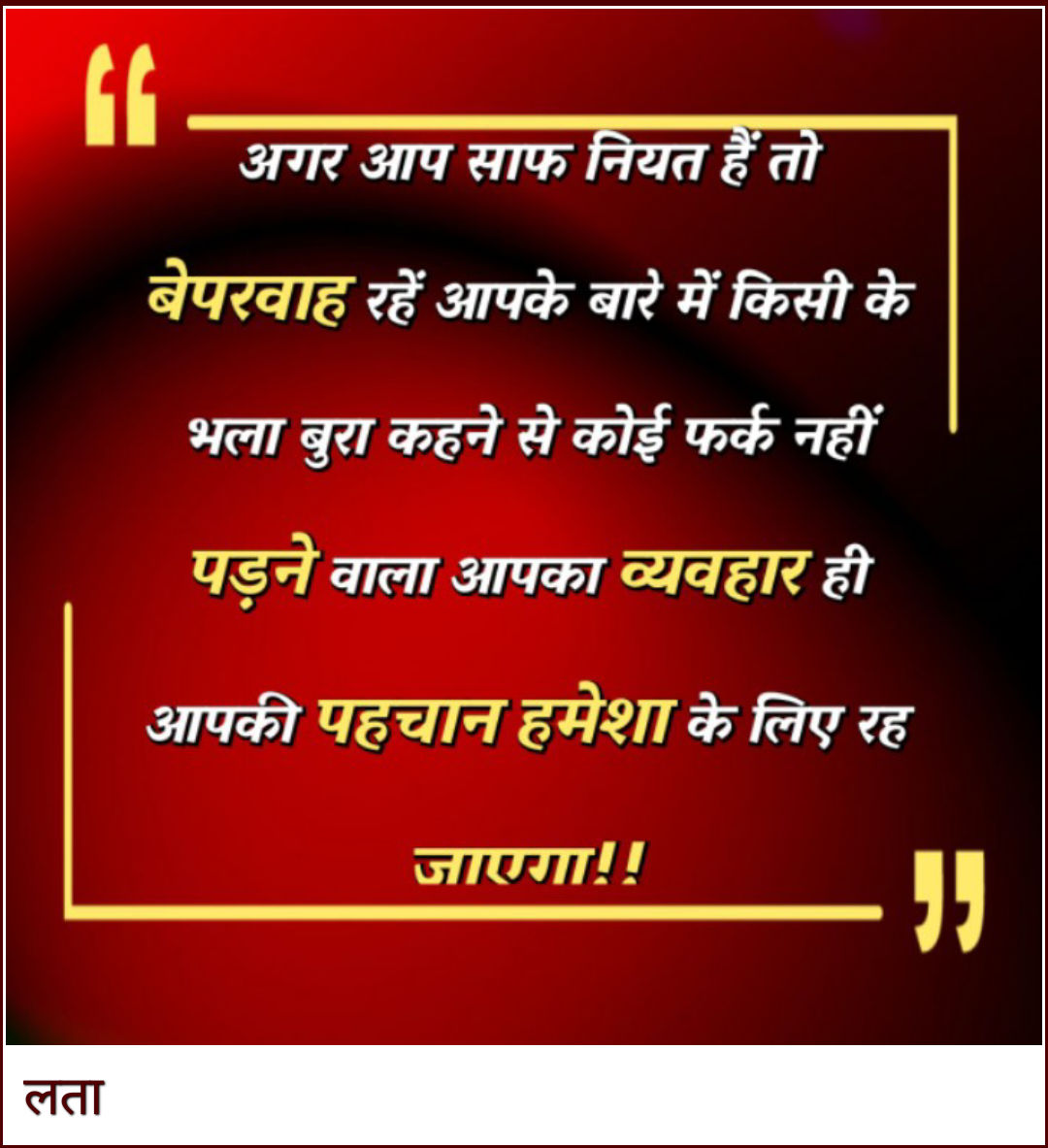 अगर आप साफ नियत हैं तो बेपरवाह रहें आपके बारे में किसी के भला बुरा कहने से कोई फर्क नहीं पड़ने वाला आपका व्यवहार ही आपकी पहचान हमेशा के लिए रह जाएगा!!
