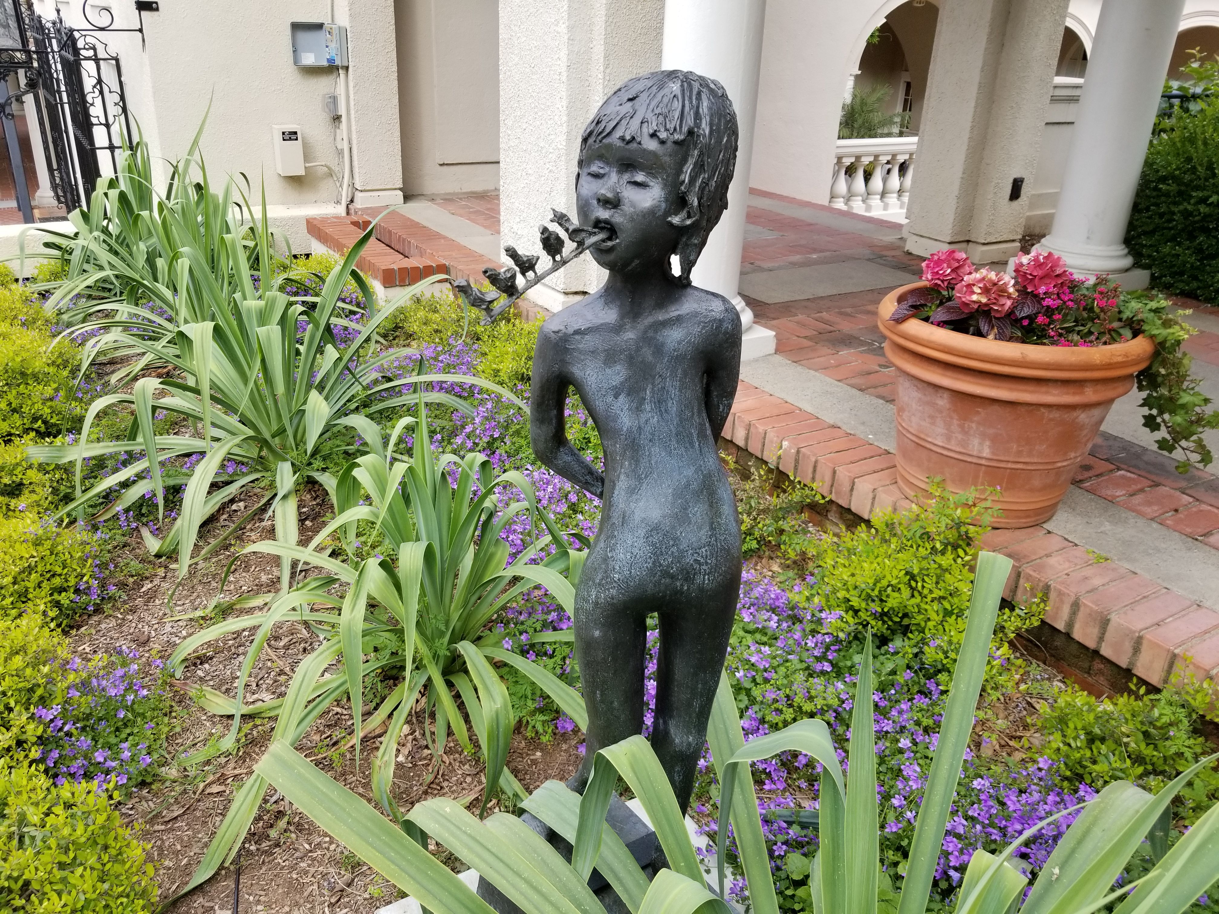 This is some of the art scattered around the park, a artists statue of a child with a stick in his/her mouth with birds chirping.