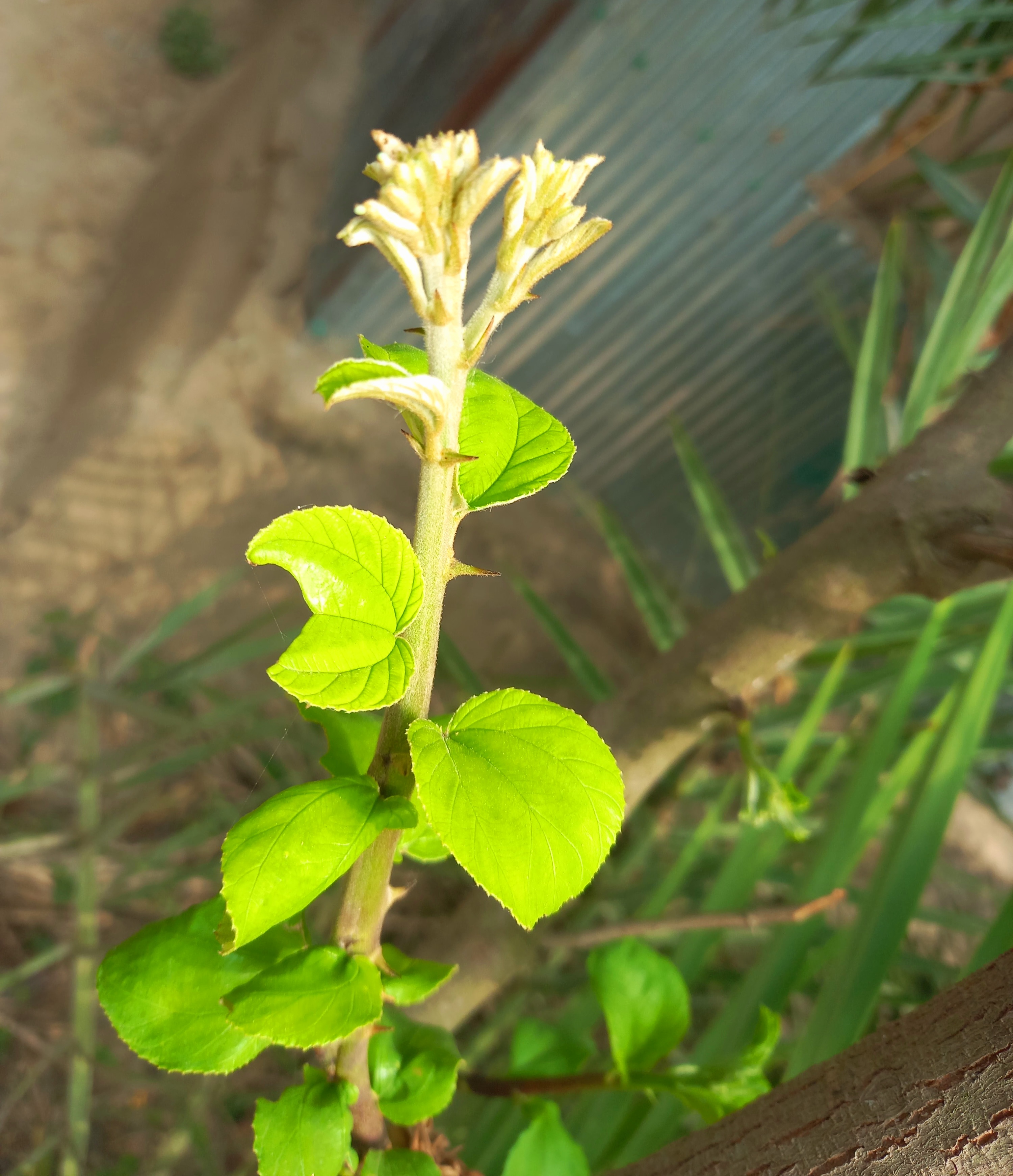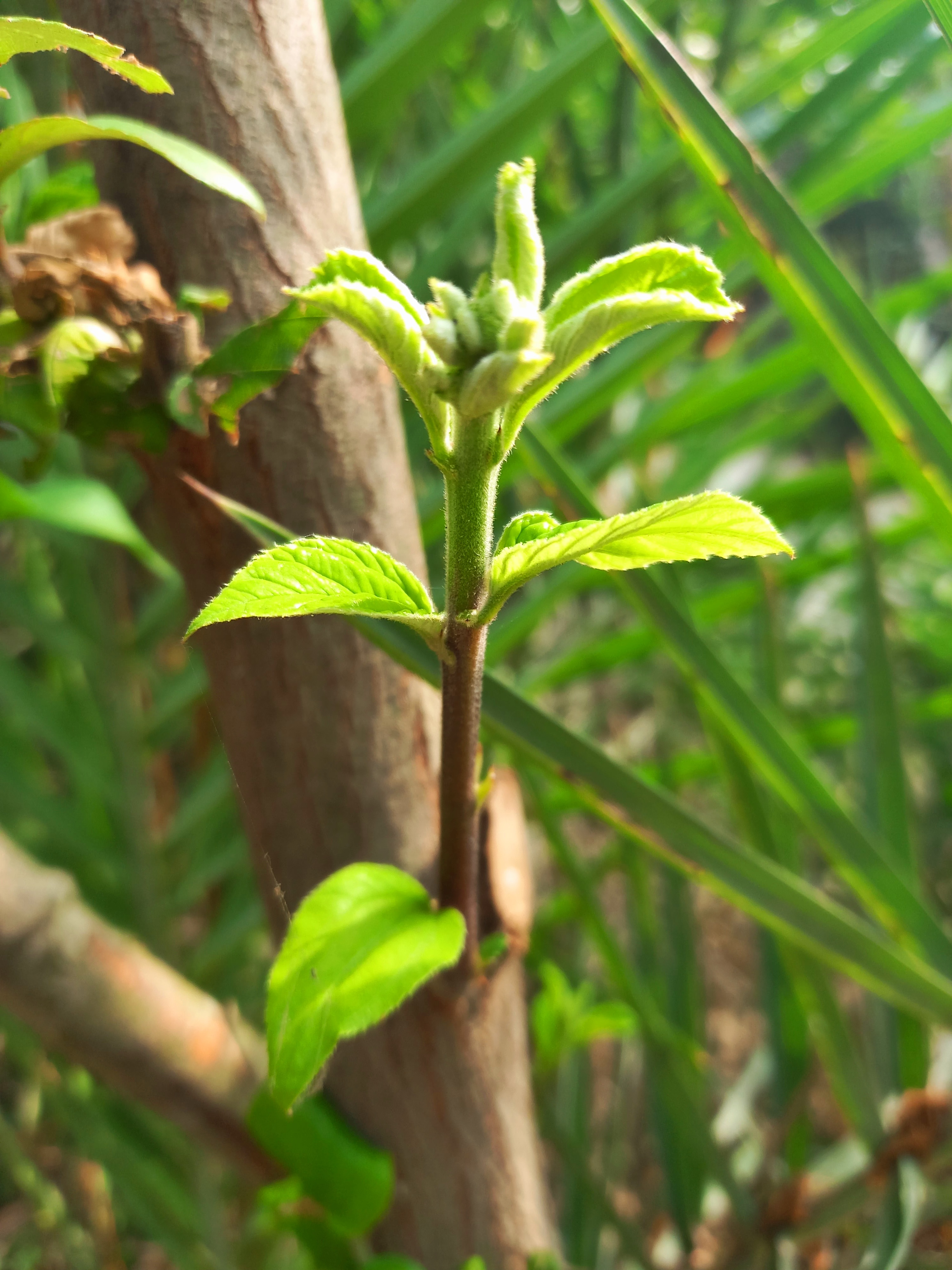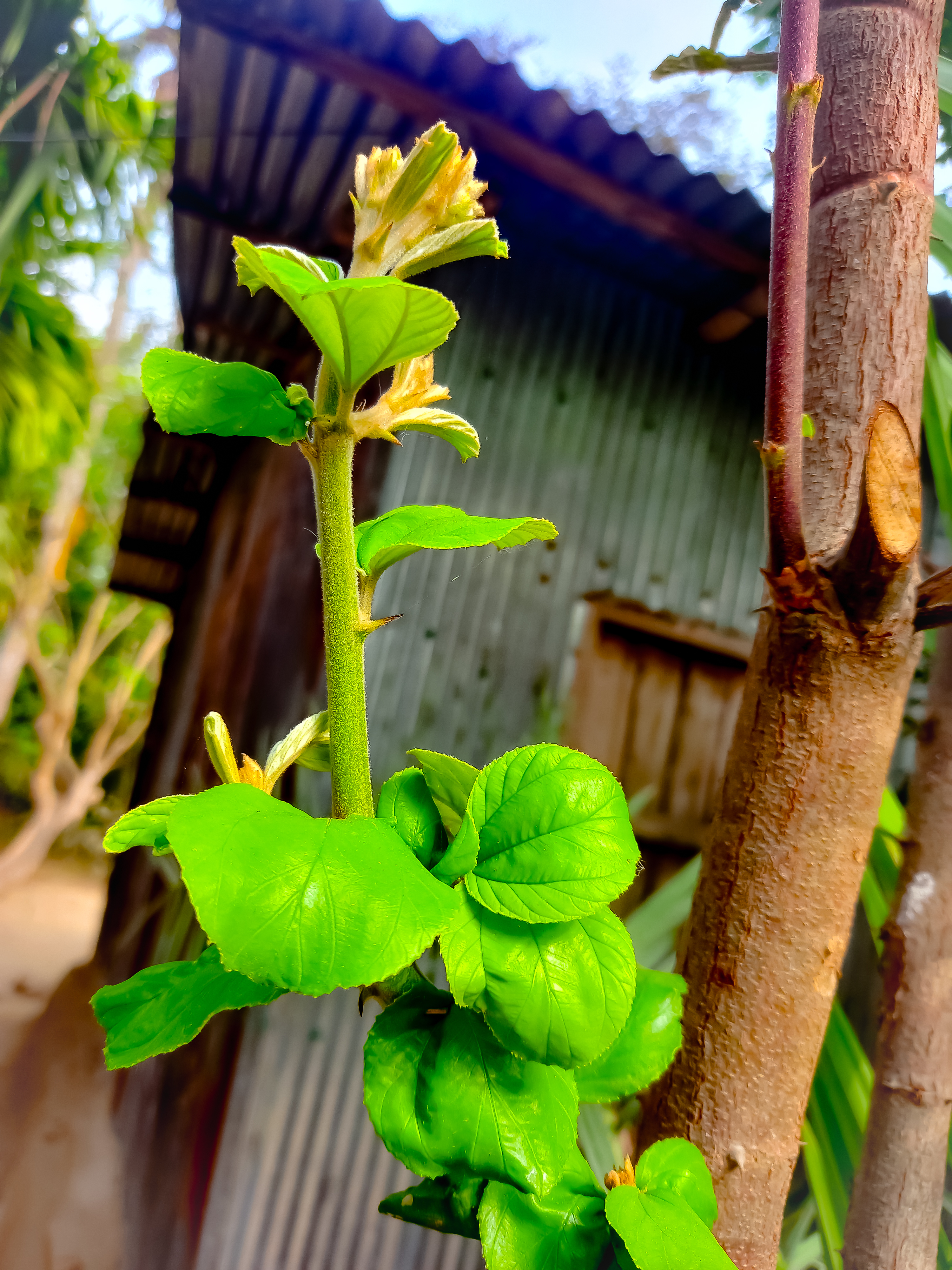 There is a small plum tree next to our house. During the fruiting season, it bears a lot of fruit. We have already collected the fruit from our plum tree. After collecting the fruit, we cut the branches of the tree. After cutting them, new leaves have now emerged on the tree.
