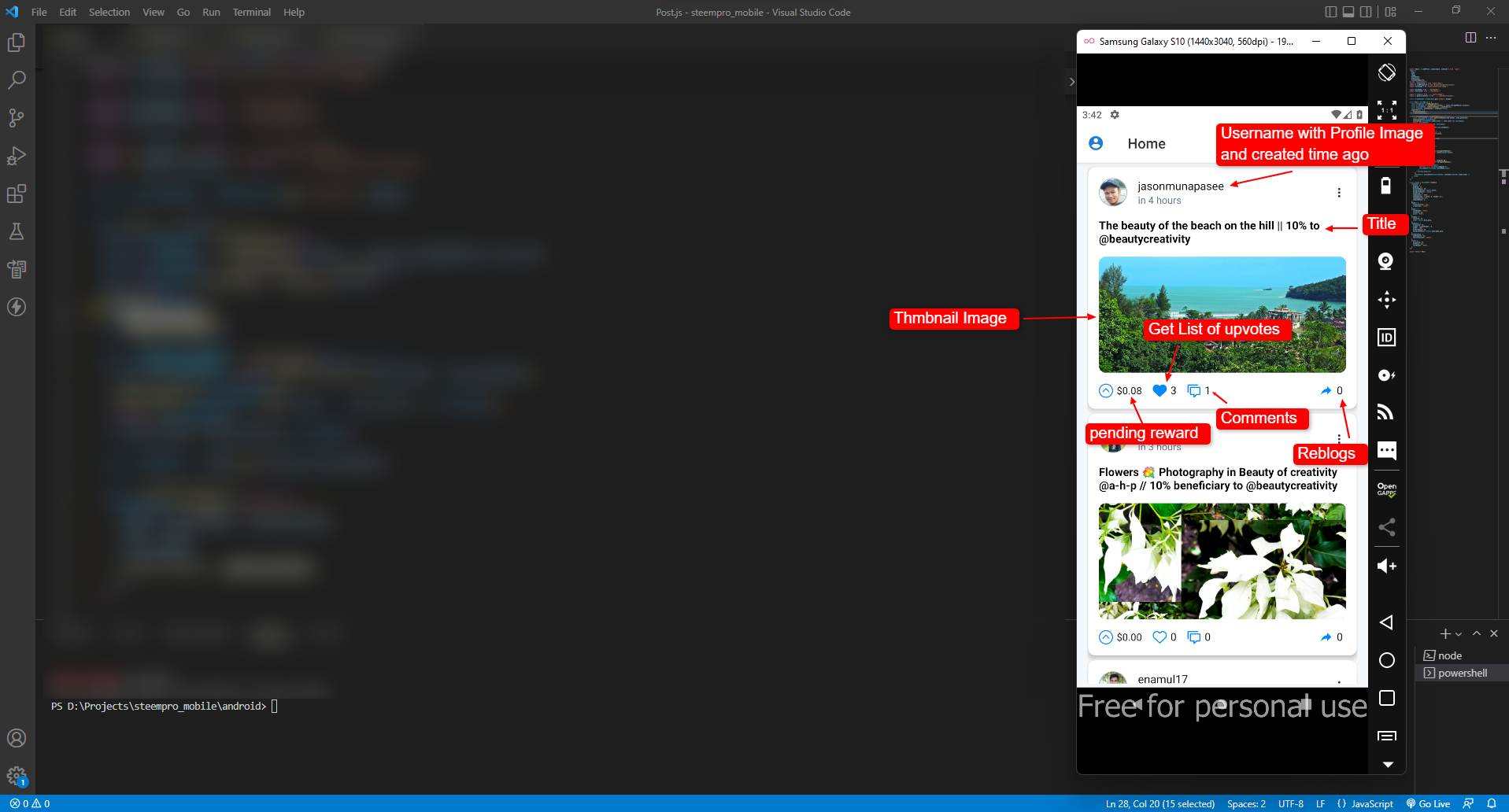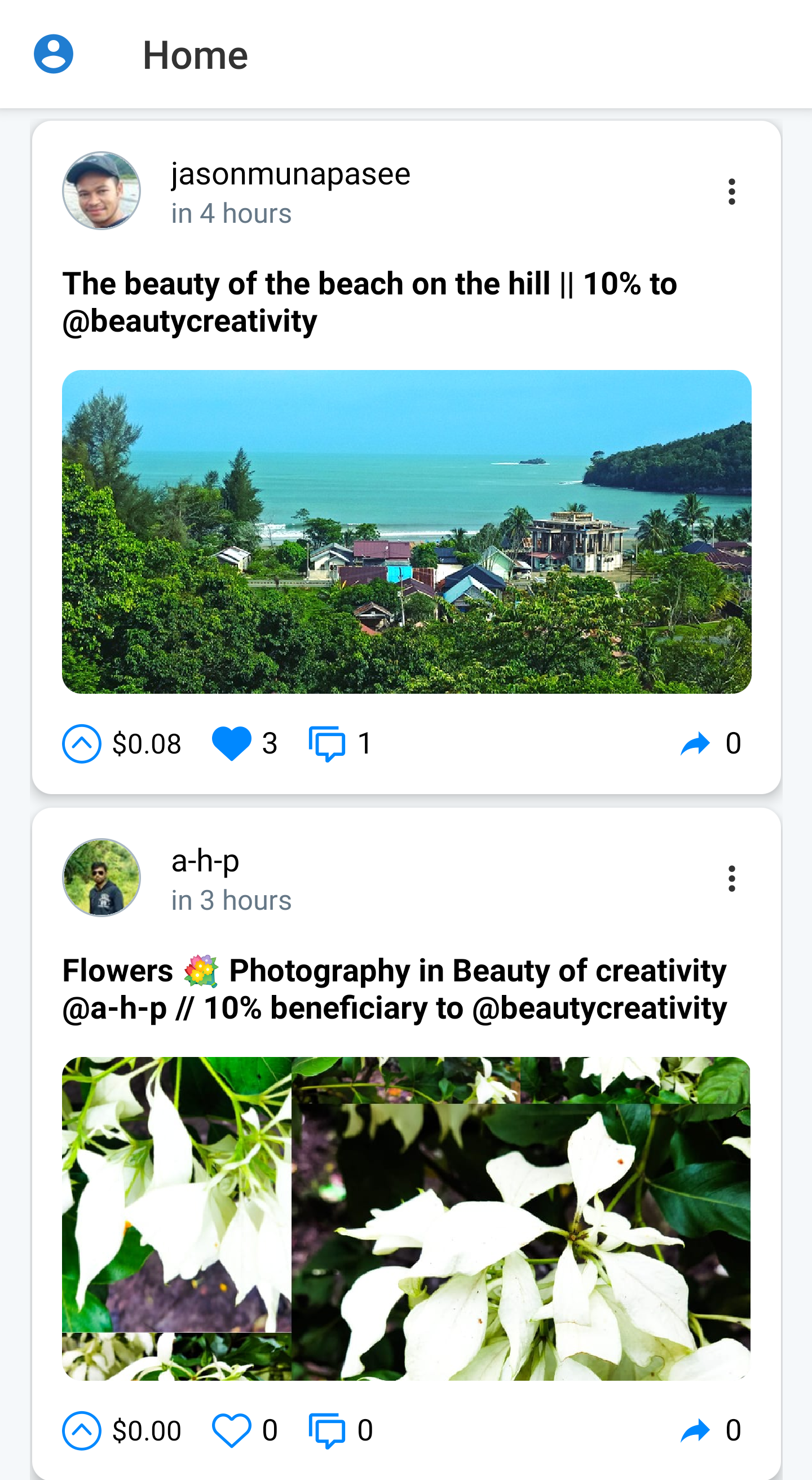 Home Screen with a nice card design posts view. A upvote button that user can use after the login. There is also a icon to get the list of users who upvote the post. Pending Reward and the comments received on the post. You can see number of reblogs a post get.