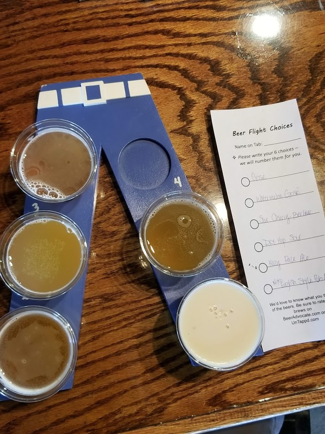 I got the six beer taster, and this is where I was already set back a bit. They serve them in plastic cups. Not good. Also I'm not crazy about their logo, and the colors remind me of Pabst Blue Ribbon. I tried to get that image out of my head.