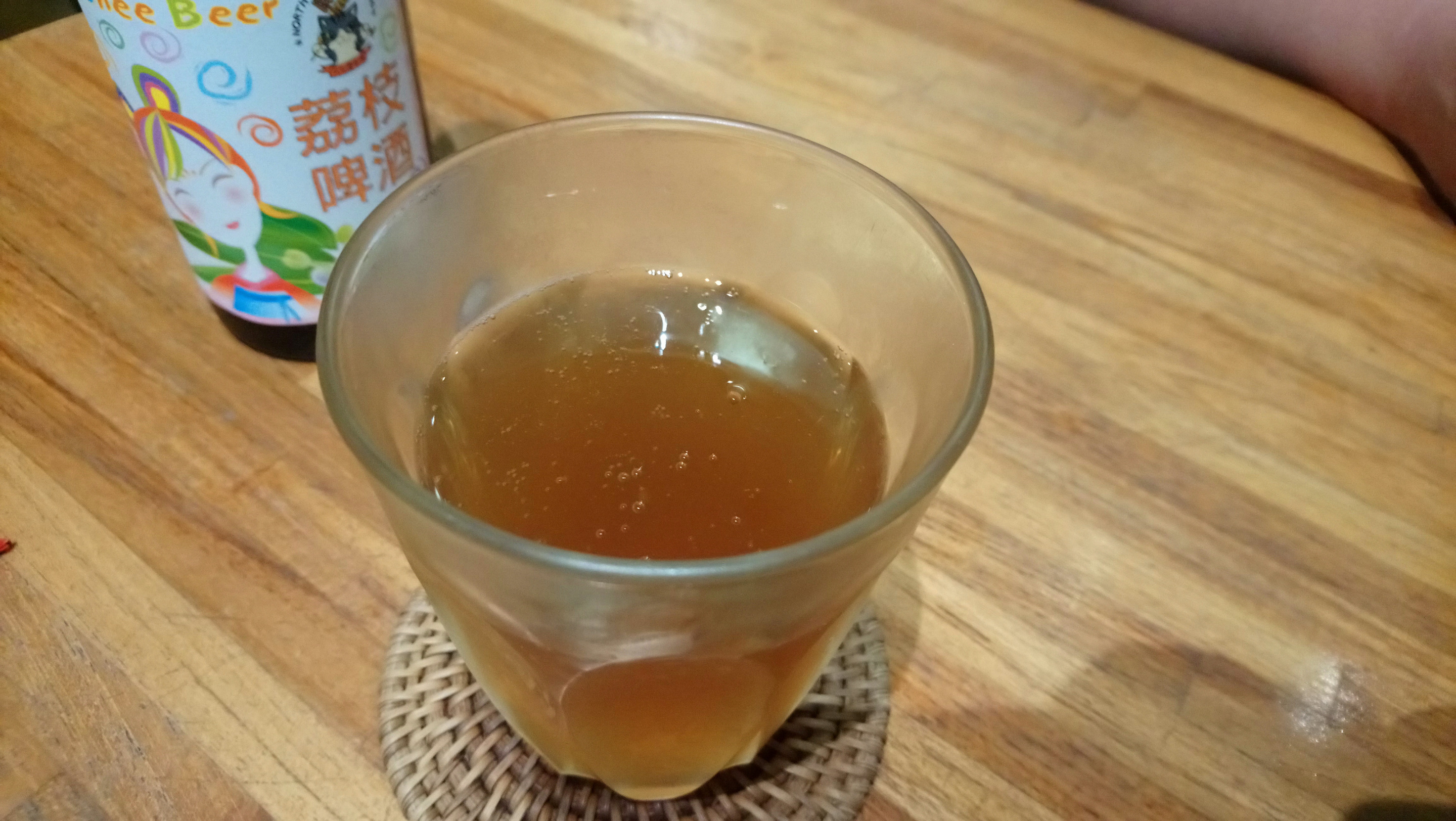 The beer comes in a standard 330m tall brown bottle, and has 5% alcohol content. All pretty standard stuff. There's a picture of the fruit on the back, which isn't exactly an accurate representation of the fruit. Their lychee looks more like a cherry, and lychee leave aren't as sharp and thin like these. I don't mean to sound mannish, but the entire bottle does scream "Girl's, come and have a drink!" I was half tempted to swap it with my wife's coffee, but she doesn't drink during the day.