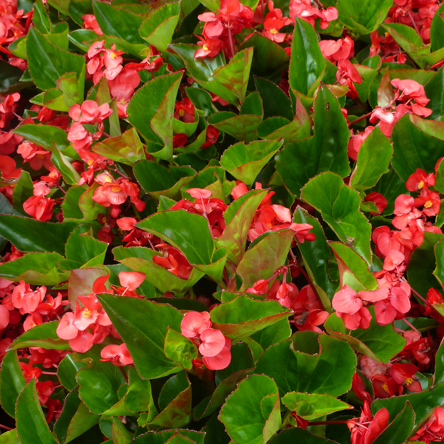 In the landscape, wax begonias (Begonia semperflorens) are most popular, with flowers that keep their rich color, even during the summer. While considered annuals, they can often survive in the landscape for several years. There are numerous single- and double-flowered varieties in shades of red, pink, and white, with either bronze or green foliage. Popular and reliable, wax begonia thrive in sun or shade and perform well in landscape beds or containers. They are tender to the cold, so should be planted in the spring, after the danger of frost has passed.