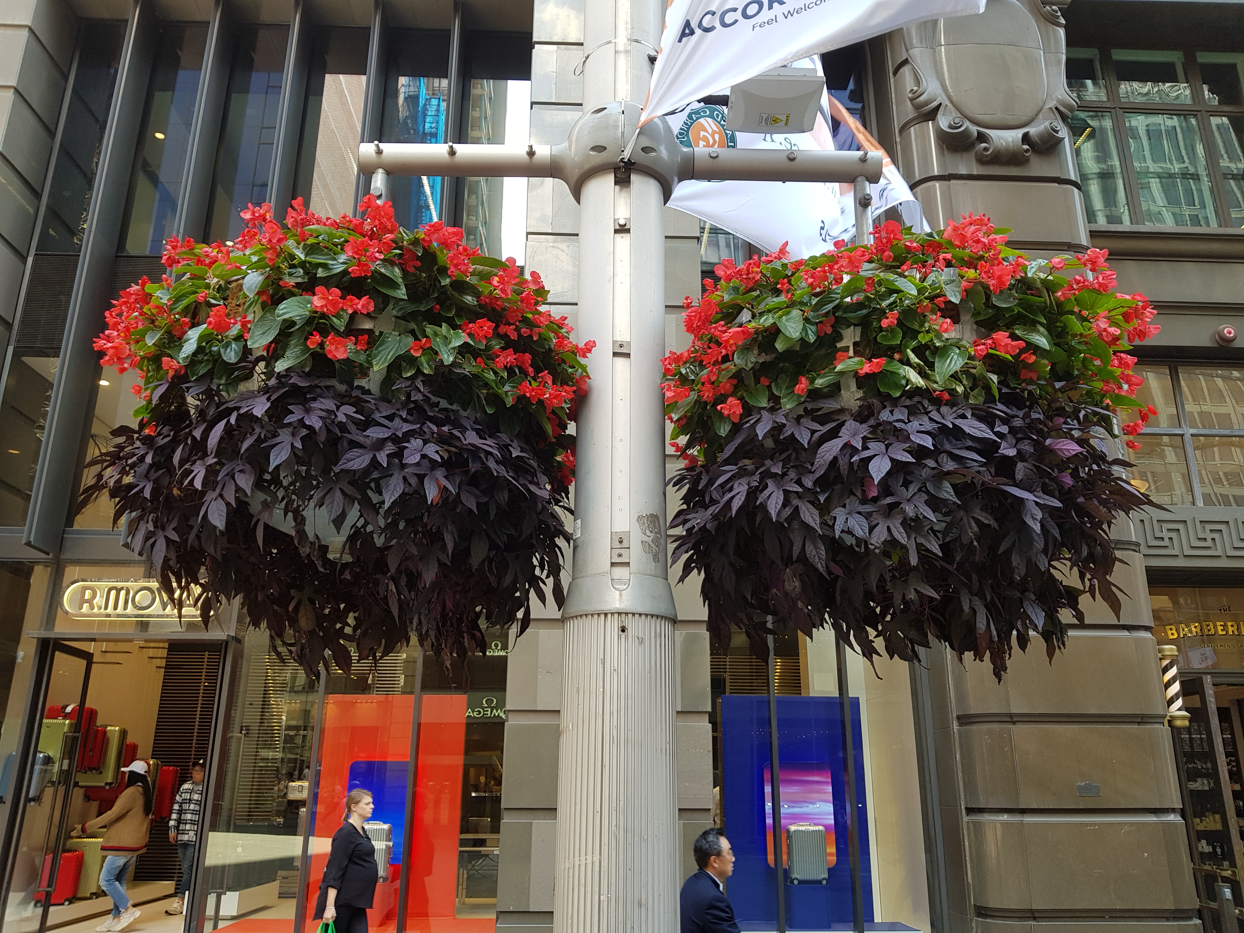 The Begonias pictured are in large hanging baskets hanging either side of utility poles in the City of Sydney , in Martin Place, where they add colour to the bustling business district. The bright red colour of the Begonias contrasts nicely with the dark leaves of the Philodendrons which are on the lower half of the baskets.