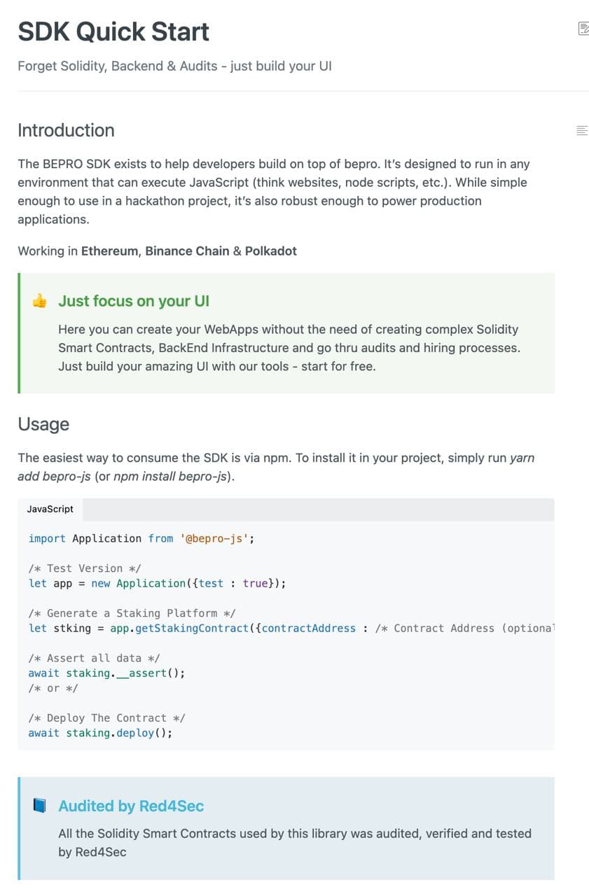 O código de On-Chain Staking estará disponível na biblioteca BEPRO-js, disponível para operadores que apostam $BEPRO para acesso. Depois de provar sua aposta, eles receberão uma chave de API para acessar nossa rede e poderão usar o código sob licença de nosso Github.