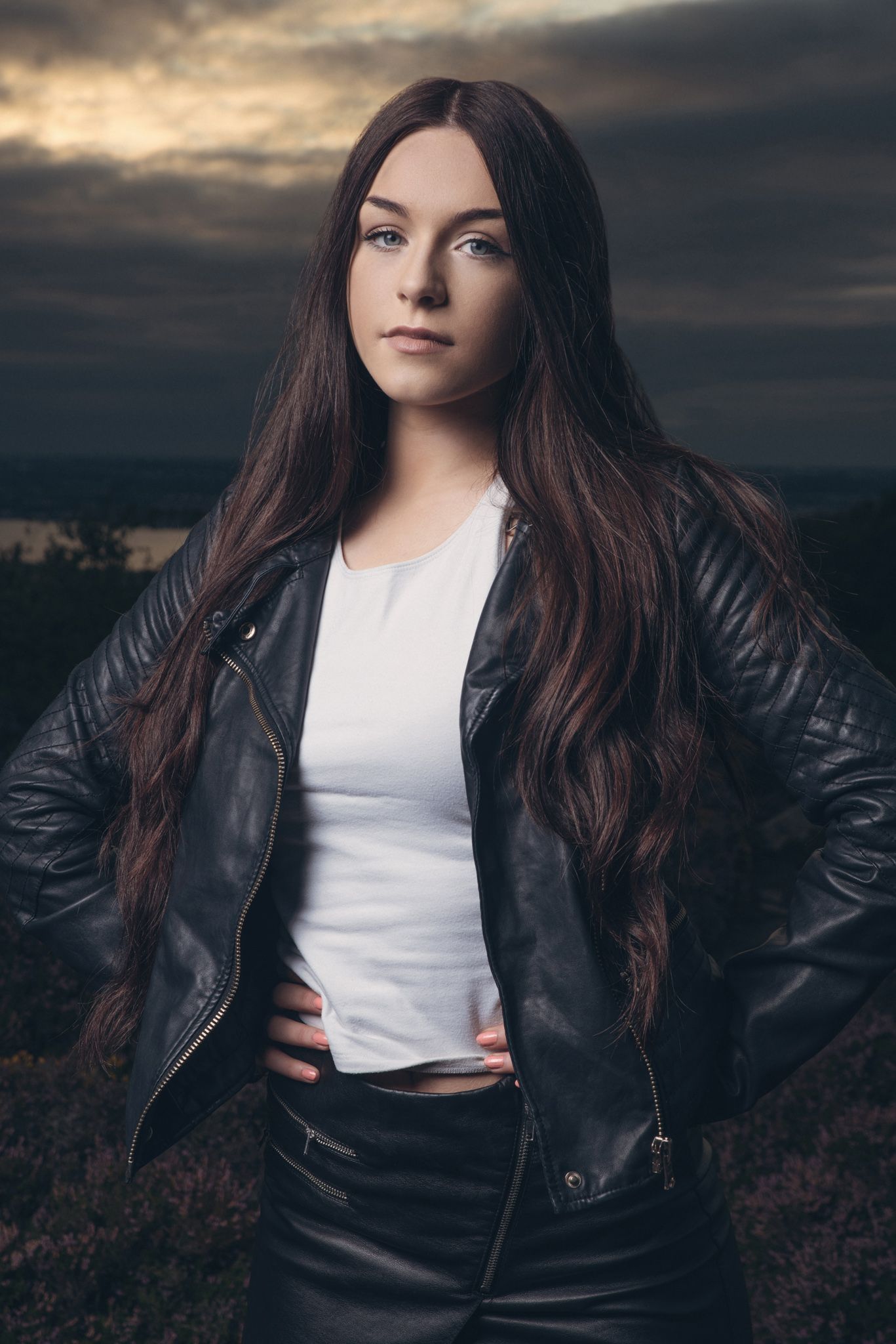 First one ... Number one ! Great picture ! I like it, the smooth light effect and a beautiful sky on background of a beautiful girl. Particular also the effect of dark leather clothes with perfect light on.