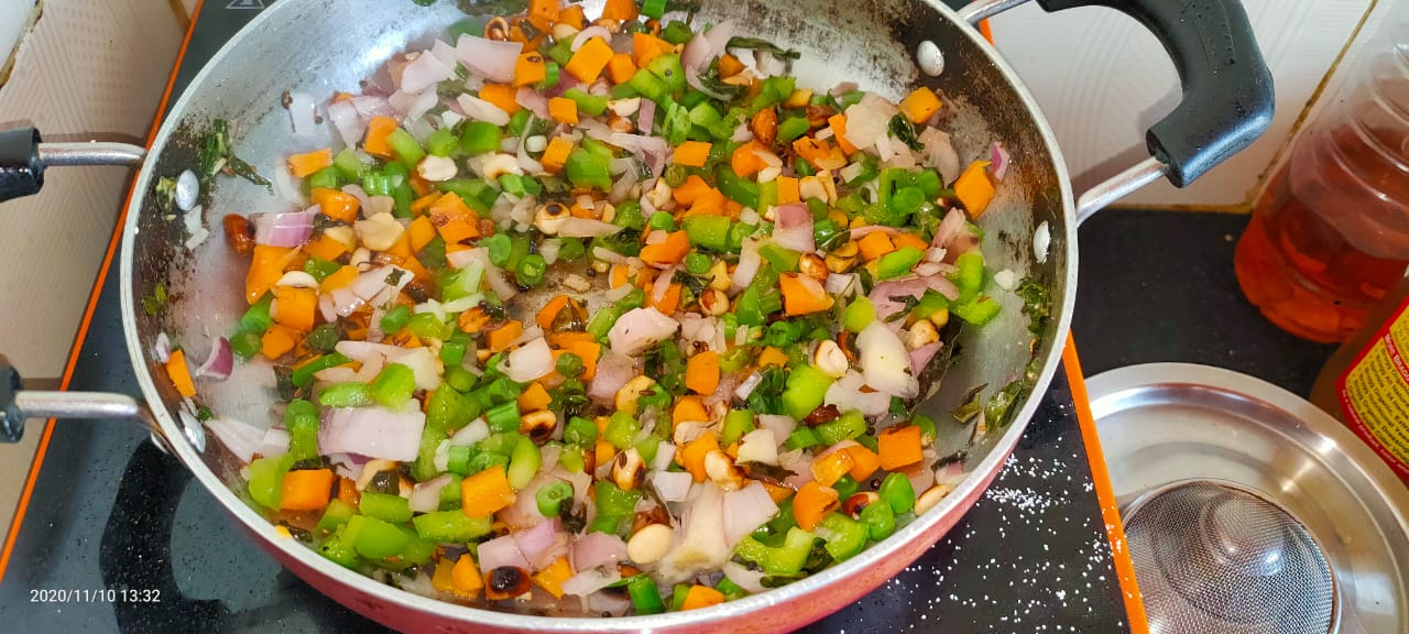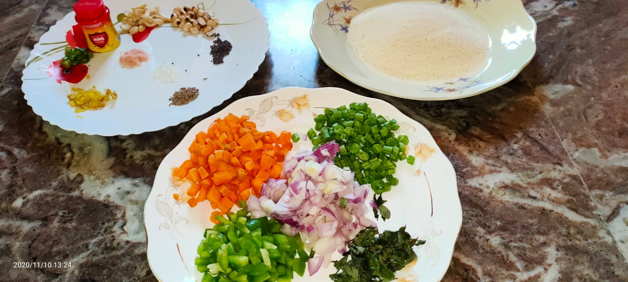 Today I am here to share with you the process of making "Vegetable Upma". Before that would like to share the story of the dish. Upma (uppidi pindi in Telegu) was originally a widows' dinner. Widows' were banned from eating salt and spice. They were also not supposed to eat a full course rice meal for dinner. So they soak rice in water and dry it to make semolina out of it. Then they steam it and eat it. The dish was originally make with very few available ingredients,since widows' and poor people were not able to afford vegetables. The typical Tamilian Upma has just onions,green chilies and few curry leaves apart from the semolina.