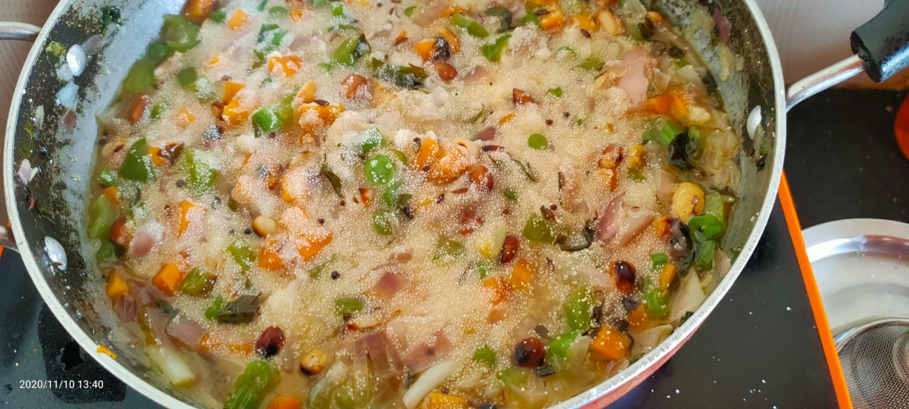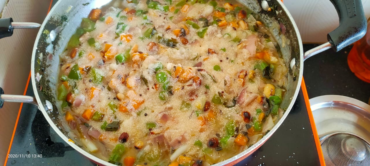 Step 4- Now add all the vegetables mentioned above. Chopped carrots,green peas, chopped french beans. Stir and cook covered until slightly tender.