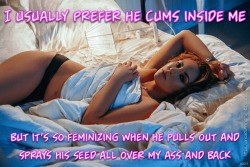This time is different from the other times you are dressed in lingerie and waiting for another guy to come over. Your reasoning with your subconscious and the most amazing transmogrification occurs in the mirror. I'm fucking sexy you think to yourself and your insides throb, sweat is building up on your scalp and you might even feel nauseous for a short time. Suddenly you have made some crazy decision to stay in the feminine energy and making a Facebook page for your new persona seems like a good idea to start at this chapter in your life. Since you have been drinking alcohol and you are expected to have company in the next few minutes that girl inside you is glowing and dancing with joy the entire night and part of the next day. The man visiting you has enjoyed your sparkling charisma as well as the warmth of your pussy that is filled with cum the next day. He tells you that you are a good girl and wants to come over again tonight and you are struck with a huge sense of satisfaction in the way you have wanted when you quickly say.....YES DADDY with the sensation and voice of a woman's perspective in both his view and yours.