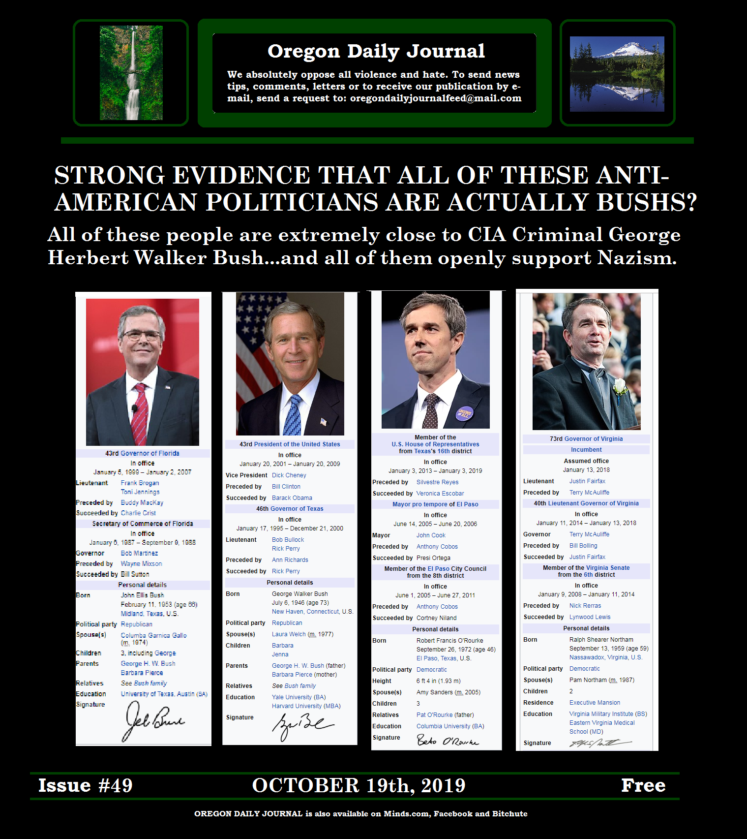 Ralph Northam and Beto O'Rourke both appear appear to be CIA MK Ultra mind-controlled members of the Bush family under adoptive names. George H.W. Bush, George W. Bush, Jeb Bush Northam and Beto all support mass murder and the overthrow of the United States of America by criminal gangs. They all murder babies and are racists and Satanists.