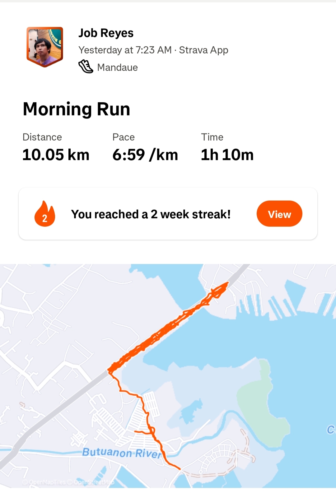 My body told me to do 10 kilometer running. I did it with a slow pace 8/ km . I crossed Cansaga Bridge two times then finished it toward the 6.5 gym for 1 hour and 10 minutes.