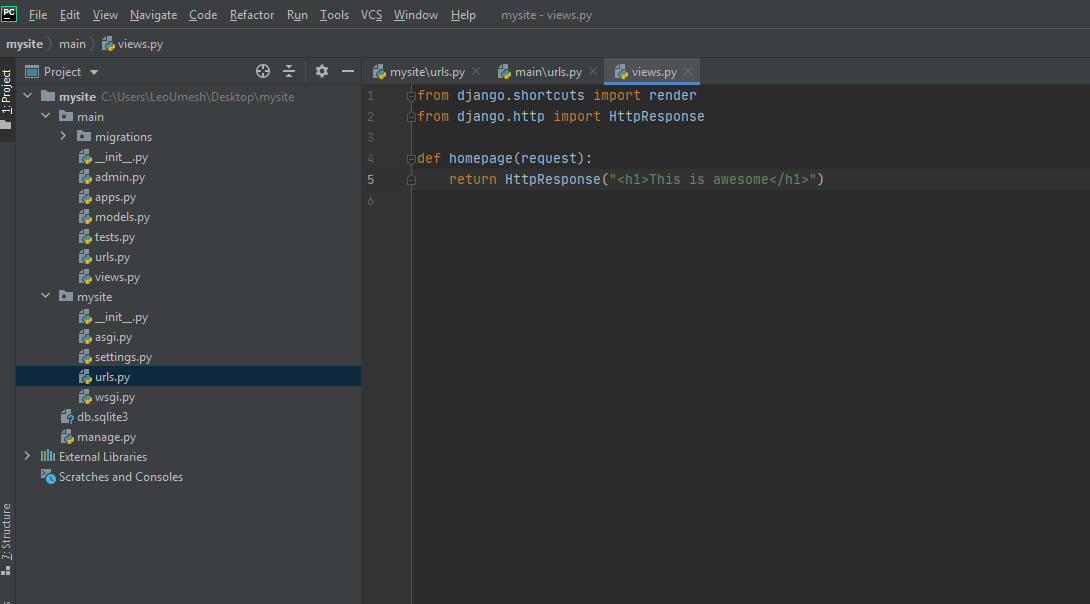 You have to create a new python file called urls.py in your app directory (which is mysite in my case). In that file add the following code: