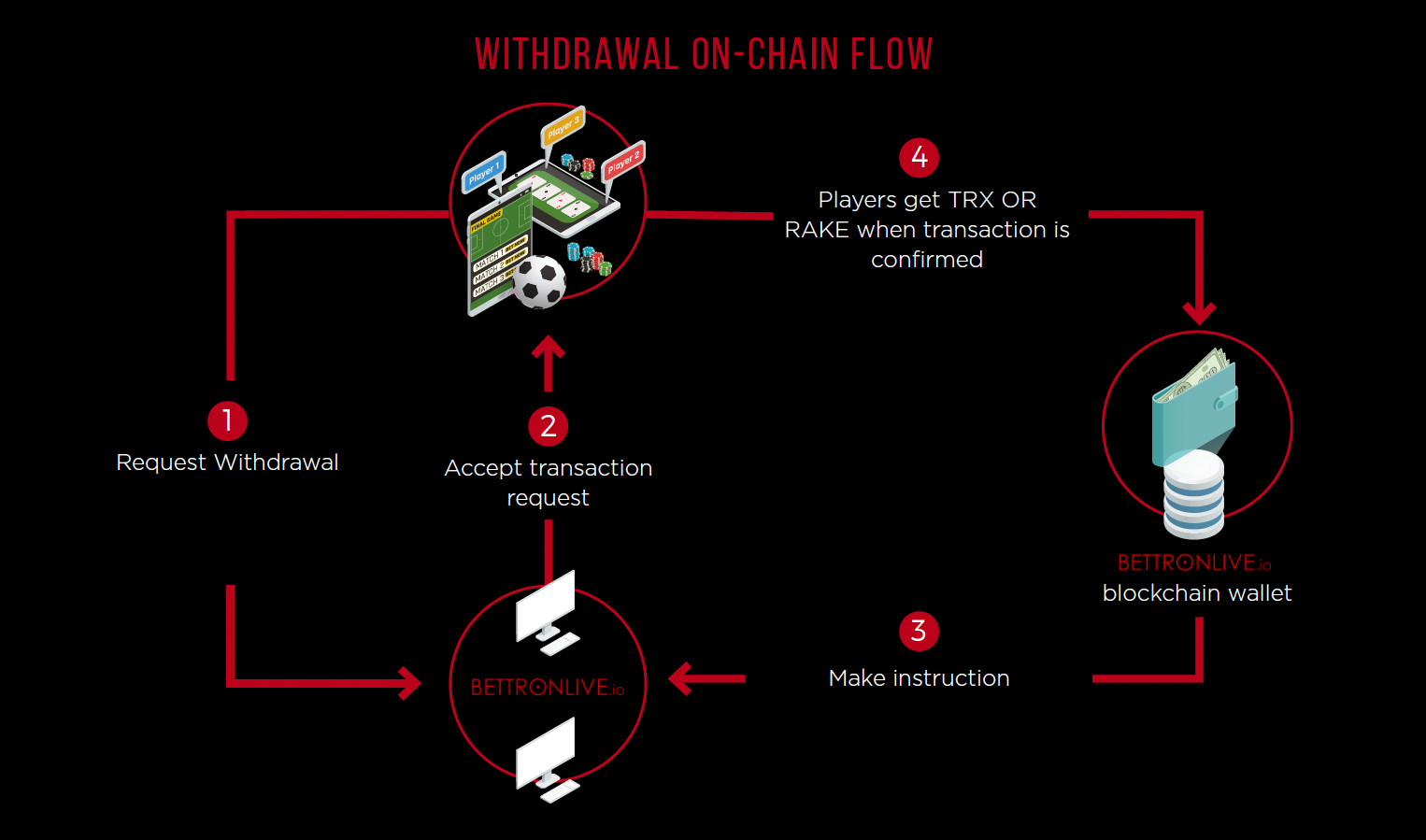 For withdrawal, users need to make a withdrawal request and the BetTronLive casino will execute the transfer from the blockchain wallet to the user’s wallet automatically.