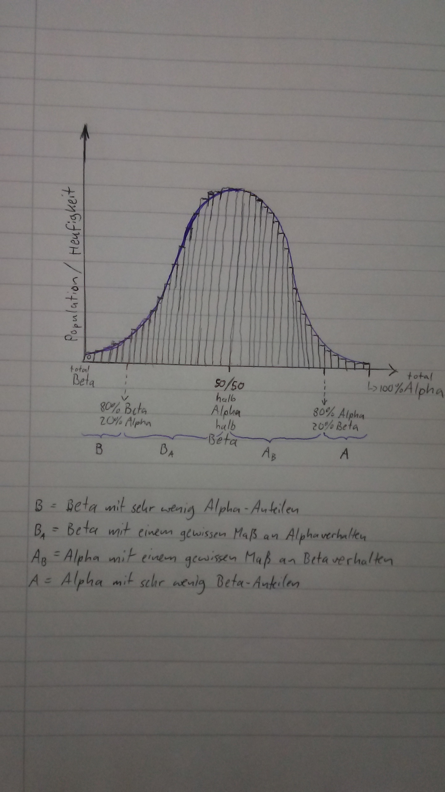 Hierzu möchte ich jetzt beide Beziehungsmodelle Monogamie und Polyamorie durchleuchten unter Anbetracht einer Skala auf der Horizontal-Achse von Beta nach Alpha und einer Normalverteilung von Männern auf dieser Skala von sehr gering bis sehr stark vertreten, ablesbar auf der Vertikal-Achse.
